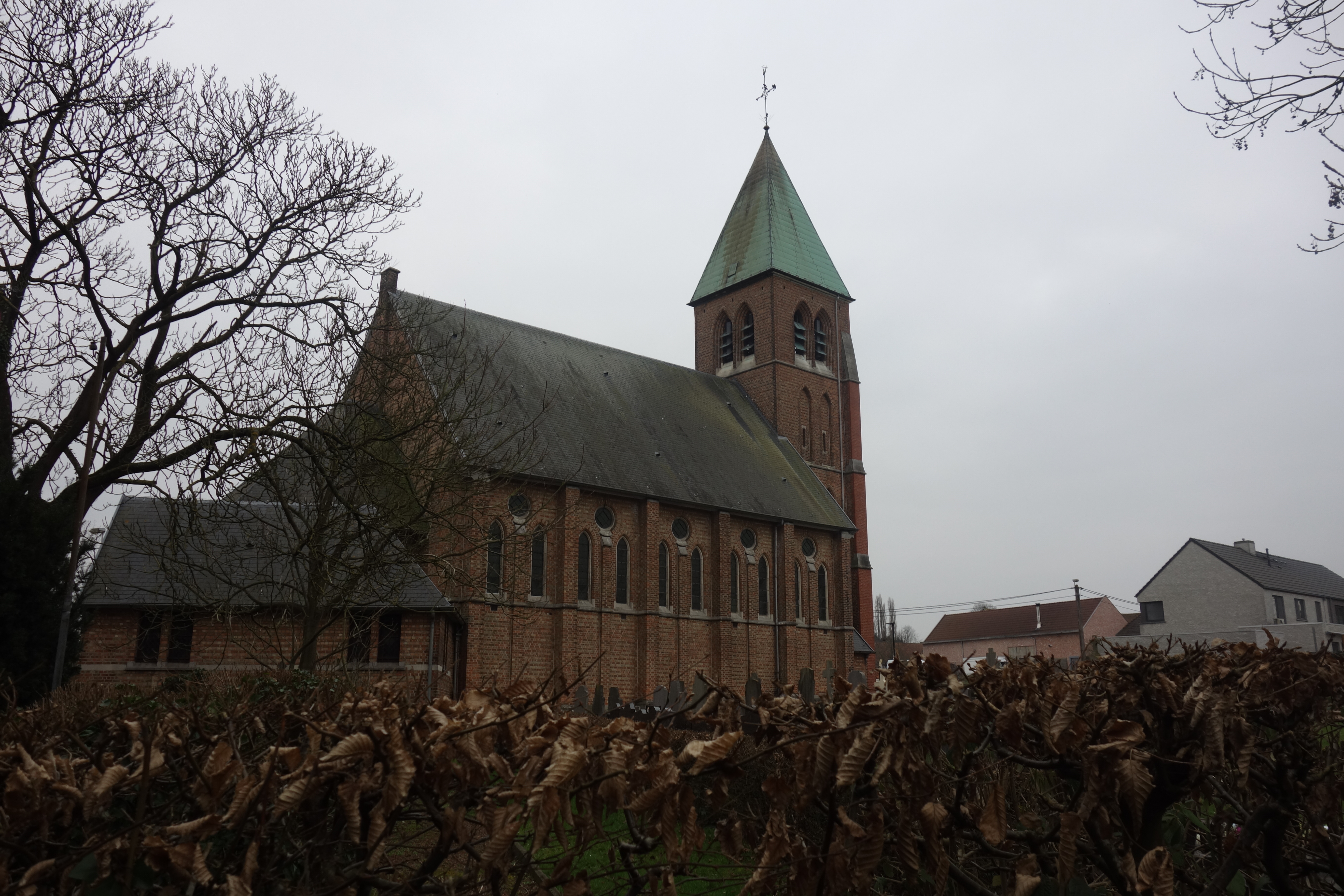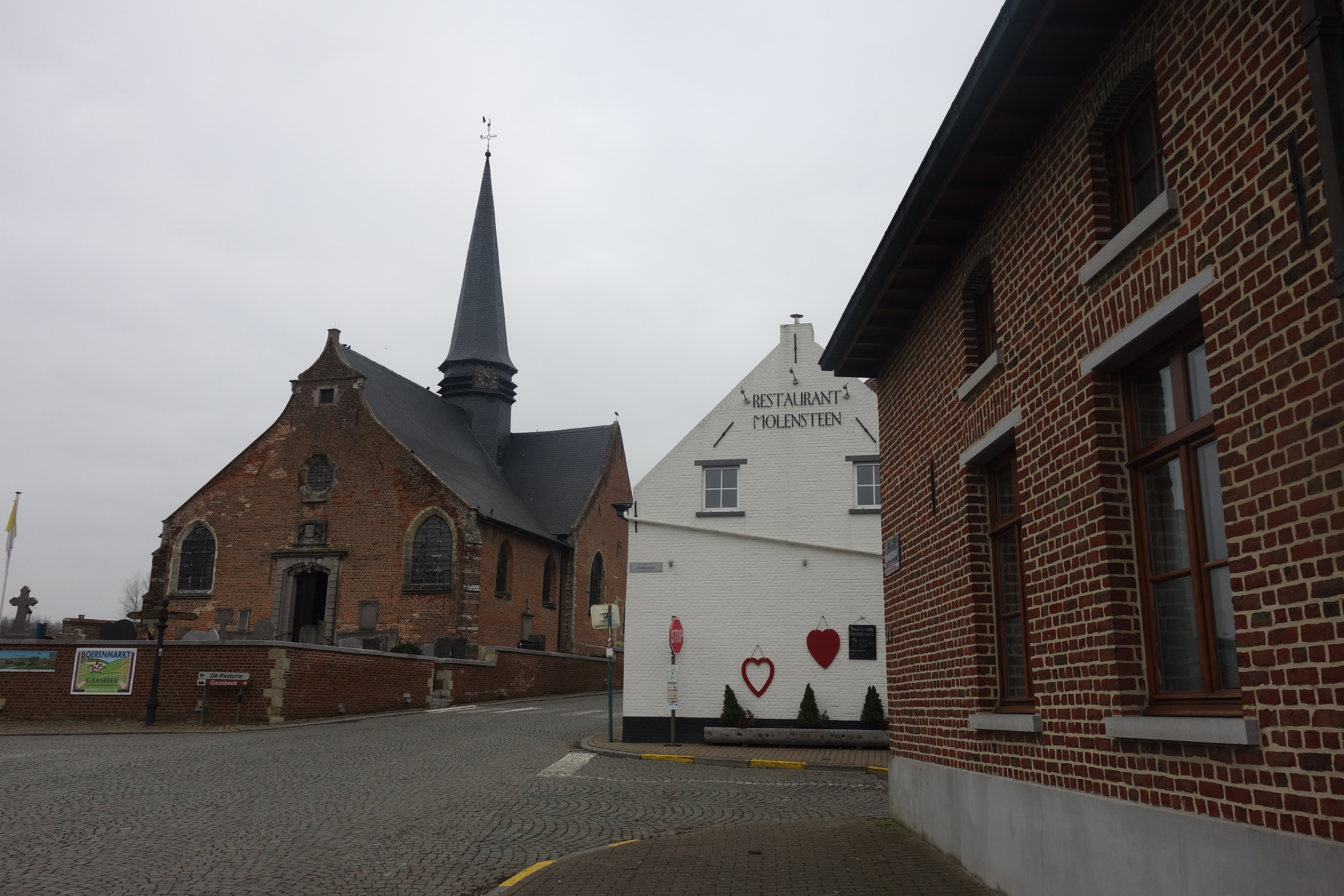 Langs een klein buurtwegje wordt het marktplein, met standbeeld Prins opnieuw in een hoofdrol, verlaten. Wat volgt is een mooi parcours te midden het glooiende landschap van het Pajottenland, af en toe onderbroken door de dorpskern van een van de vele dorpse deelgemeenten. Het eerste daarvan is Gaasbeek, gekend van het gelijknamige kasteel. Maar ook de kerk op het dorpsplein is de moeite waard om eventjes binnen te springen. Daar waren we getuigen van het feit dat devotie hier nog een ding is. Een vrouw zat knielend te bidden aan het standbeeld van Maria.