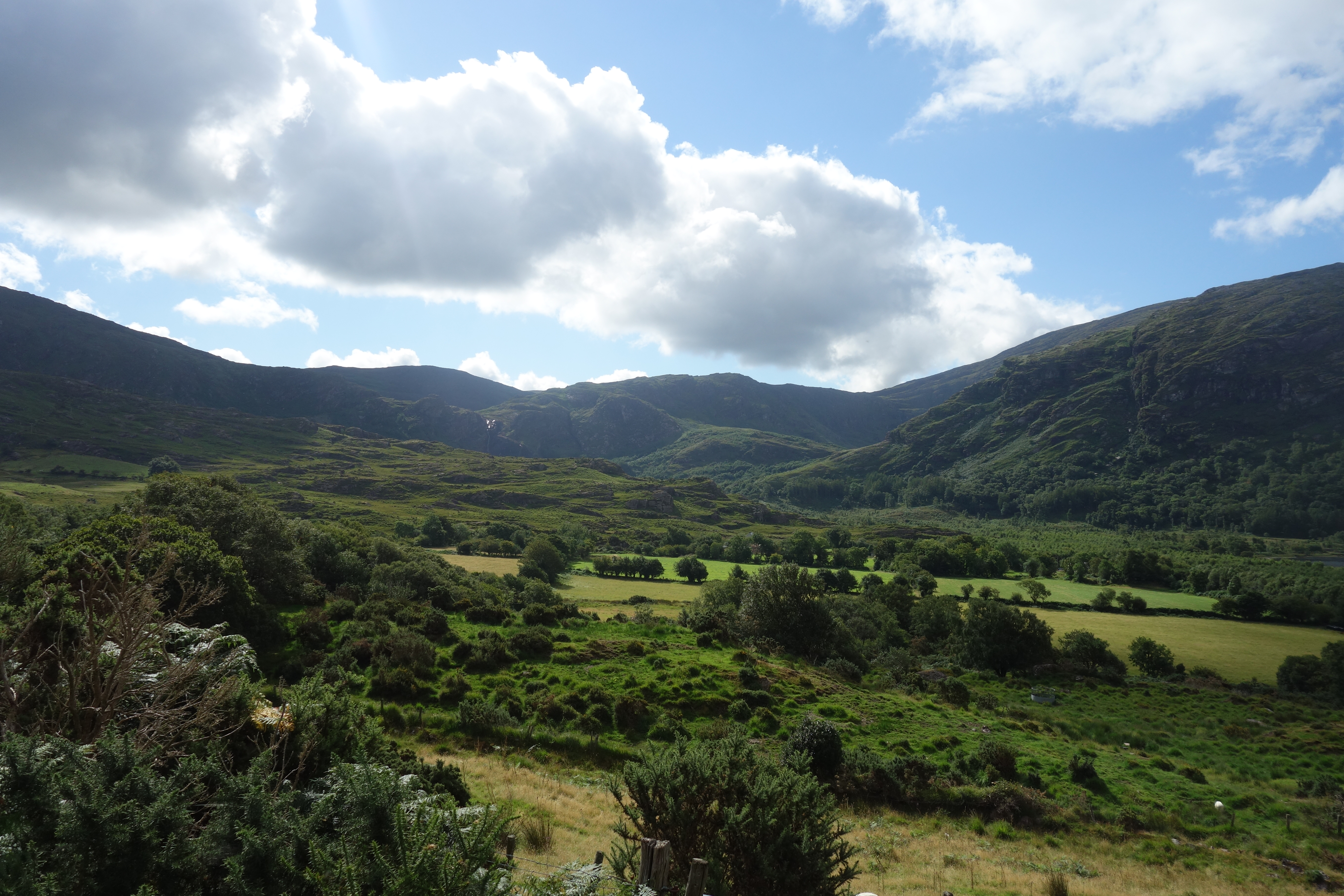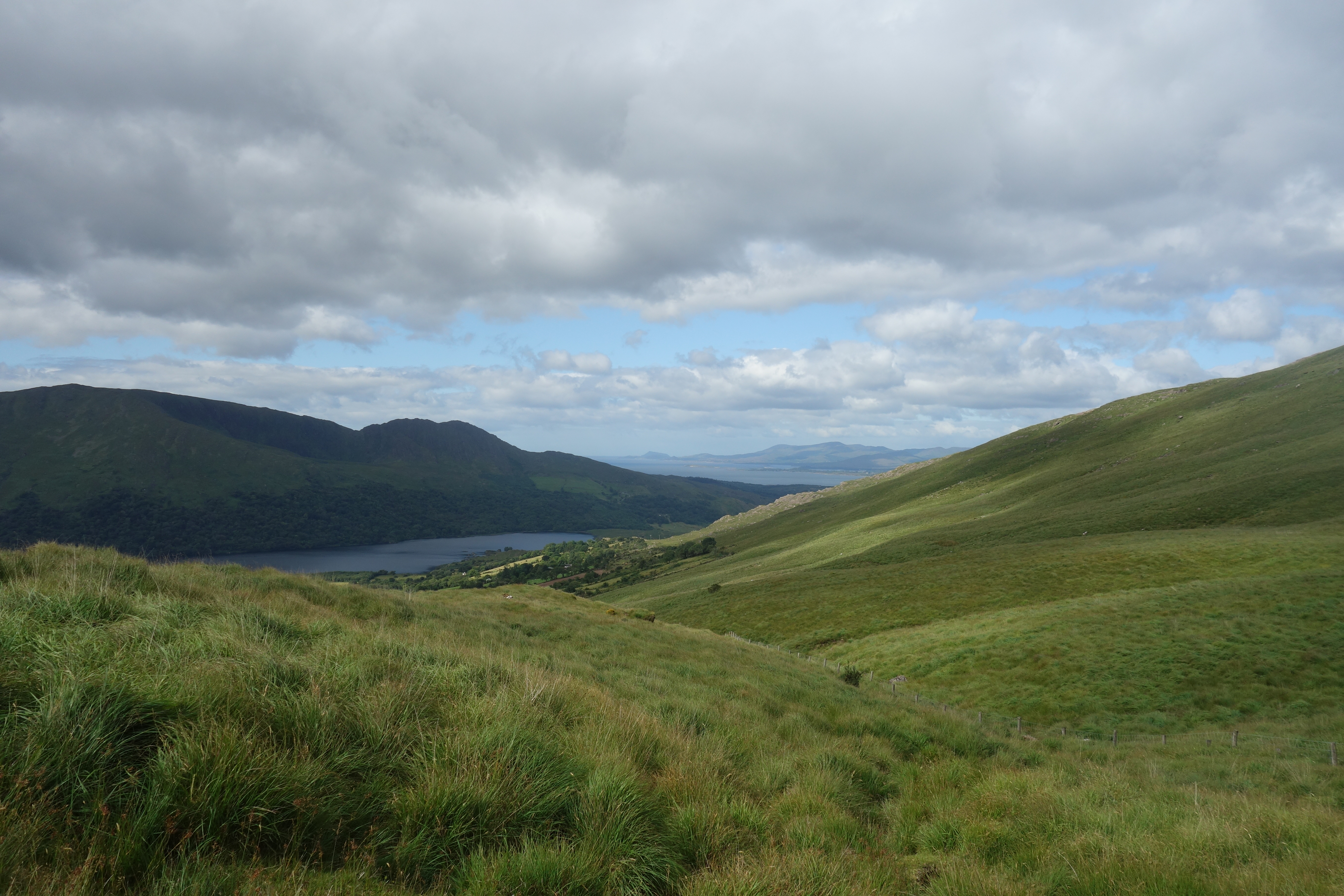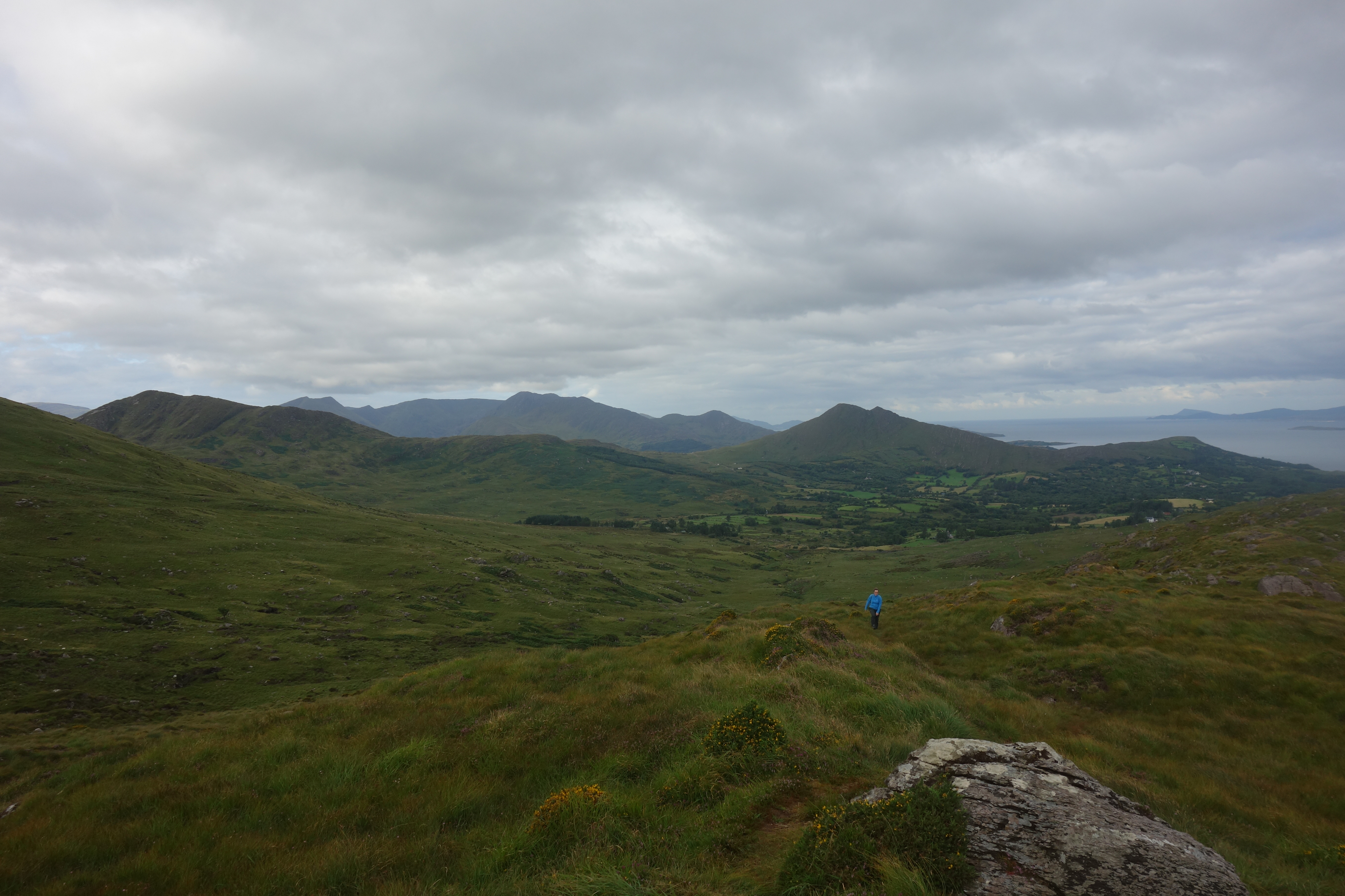 De weg was mooi maar twee veelbelovende hoogtepunten werden ons wat ontzegd. De Uragh stone circle was betalend en de 140 meter hoge Gleninchaquin waterval was verborgen in de schaduw maar stond vooral heel erg droog. Kort daarna klommen we naar onze laatste top, op een goede 350 meter.