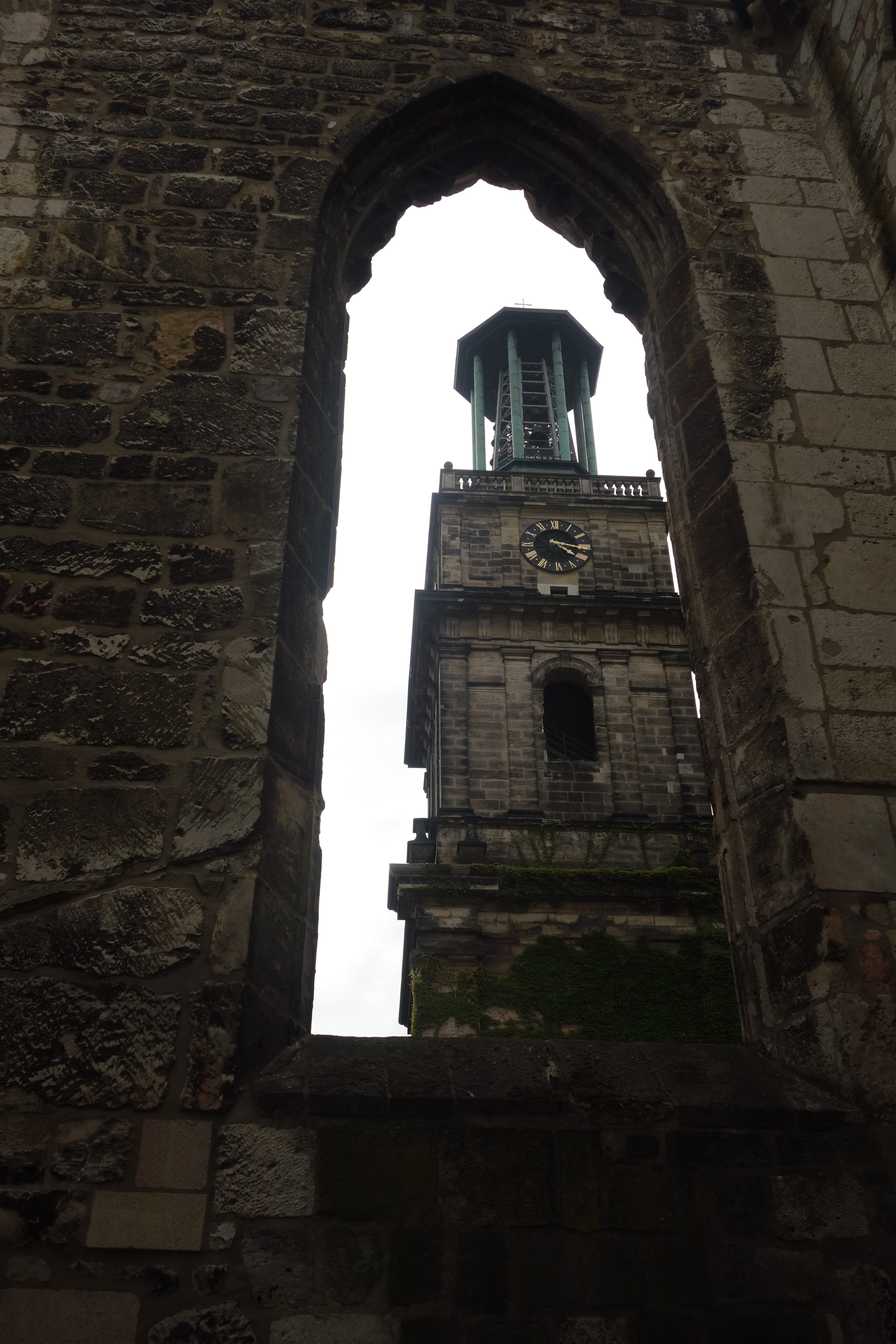 De rode draad, een stadswandeling van 4,2 kilometer, was ook zonder context leuk, al waren bepaalde passages en omwegen om deze reden soms wat bizar. Zo kwamen we in de winkelstraat of op een schijnbaar levenloos plein terecht. Er waren echter ook heel wat mooie bezienswaardigheden zoals het oude operahuis, het oude pestkerkhof, het herbouwde Rathaus, idyllisch gelegen aan een park met meertje en de kleine (heropgebouwde) historisch aandoende binnenstad.