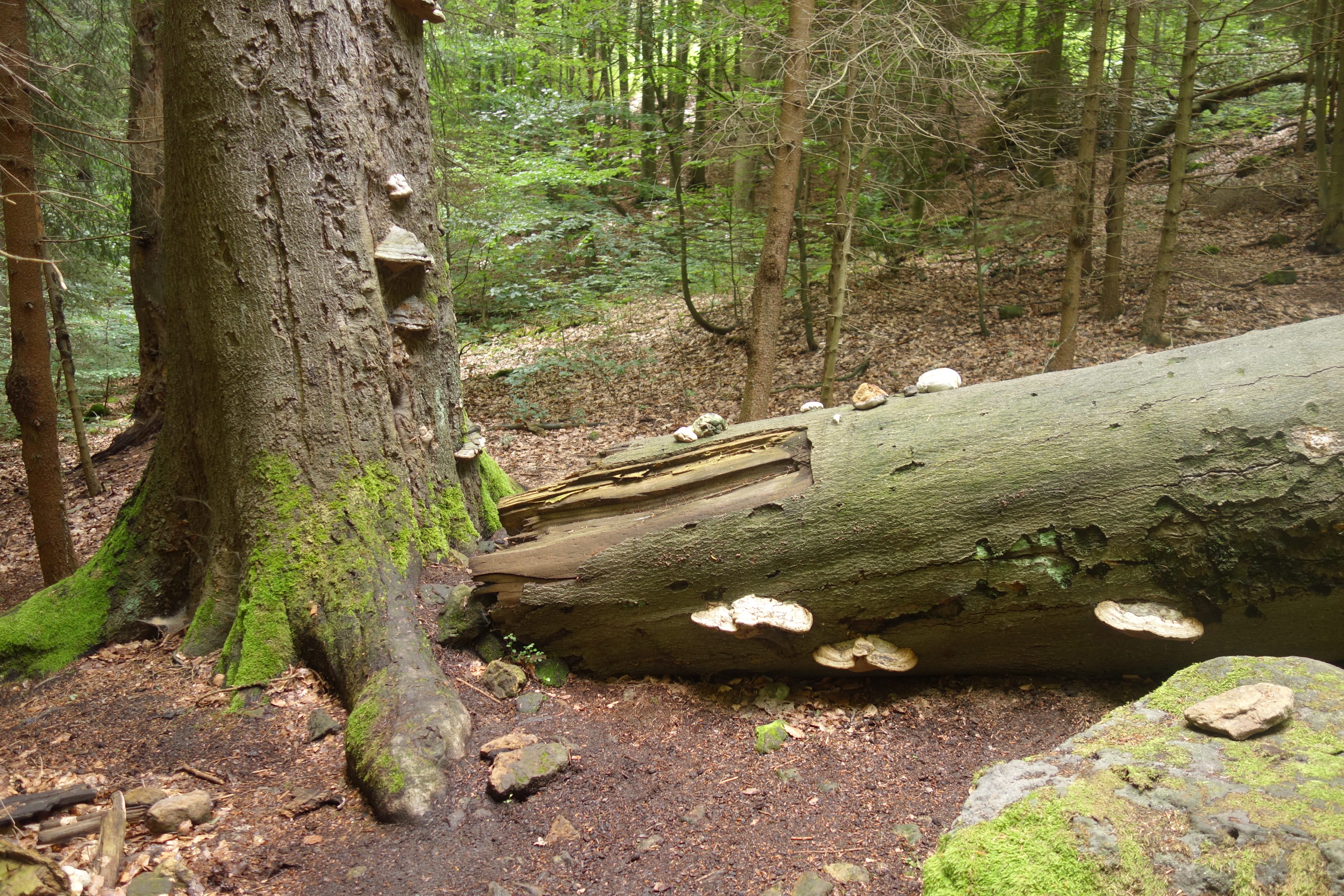 Het vervolg was opnieuw dalend langs een breed bospad waar de vista’s mooier waren dan op onze top. En zo ging het verder tot in het klein dorpje Kleingießhübel, waar we vooral de hoofdstraat moesten volgen tot aan der Hirschgrundweg, die opnieuw naar een bos voerde. Er waren op dat moment nog een goede 300 meter hoogte te overwinnen.
