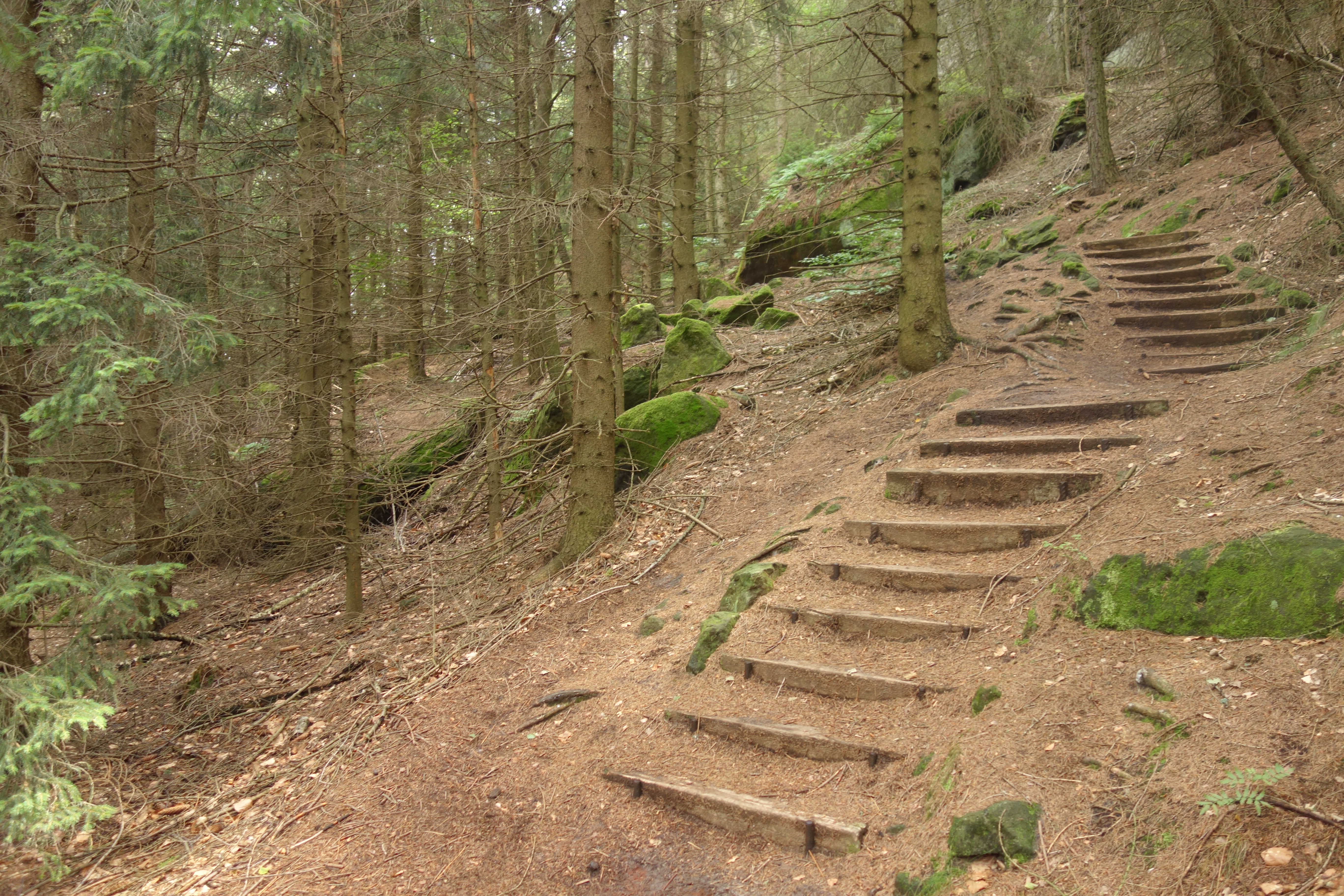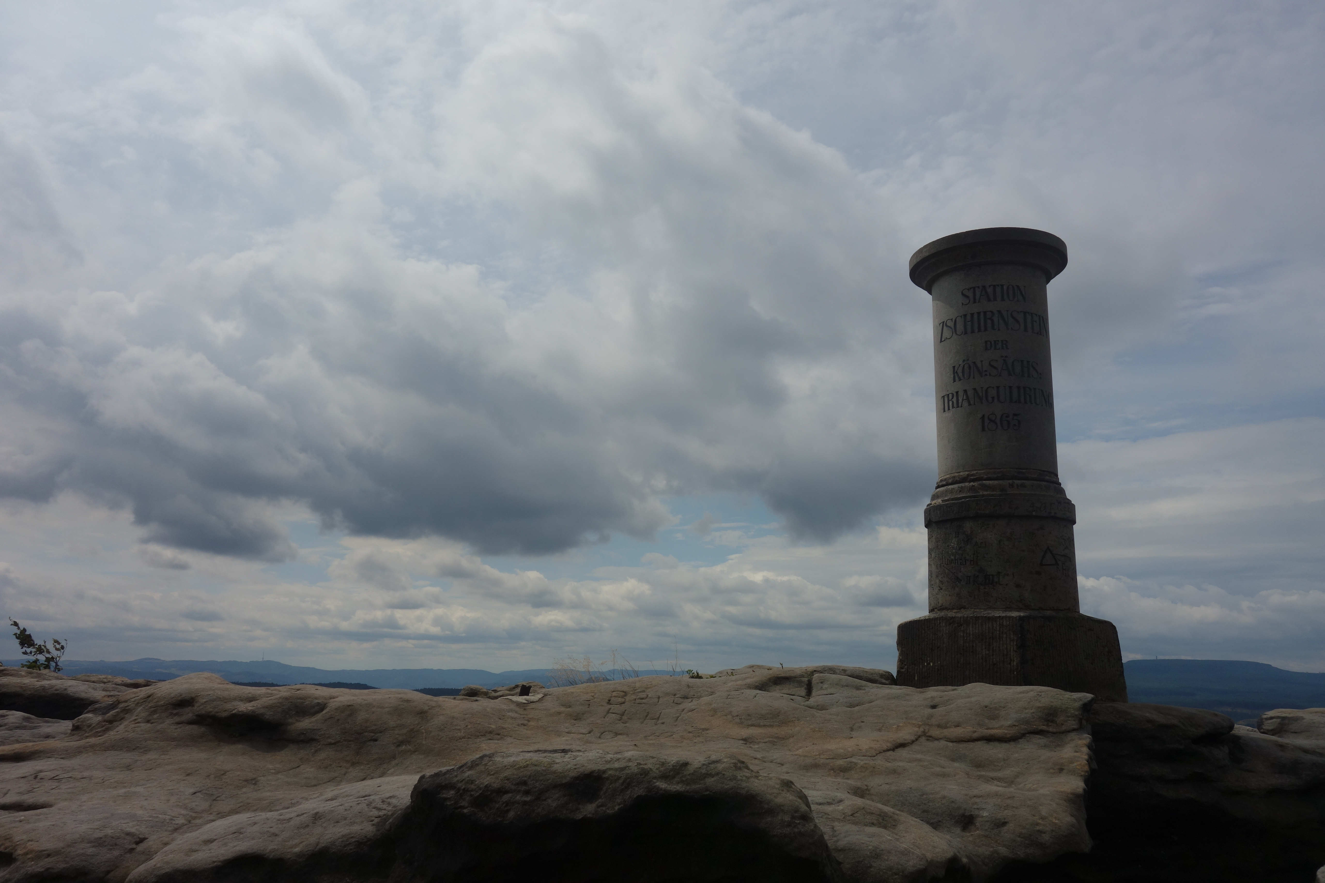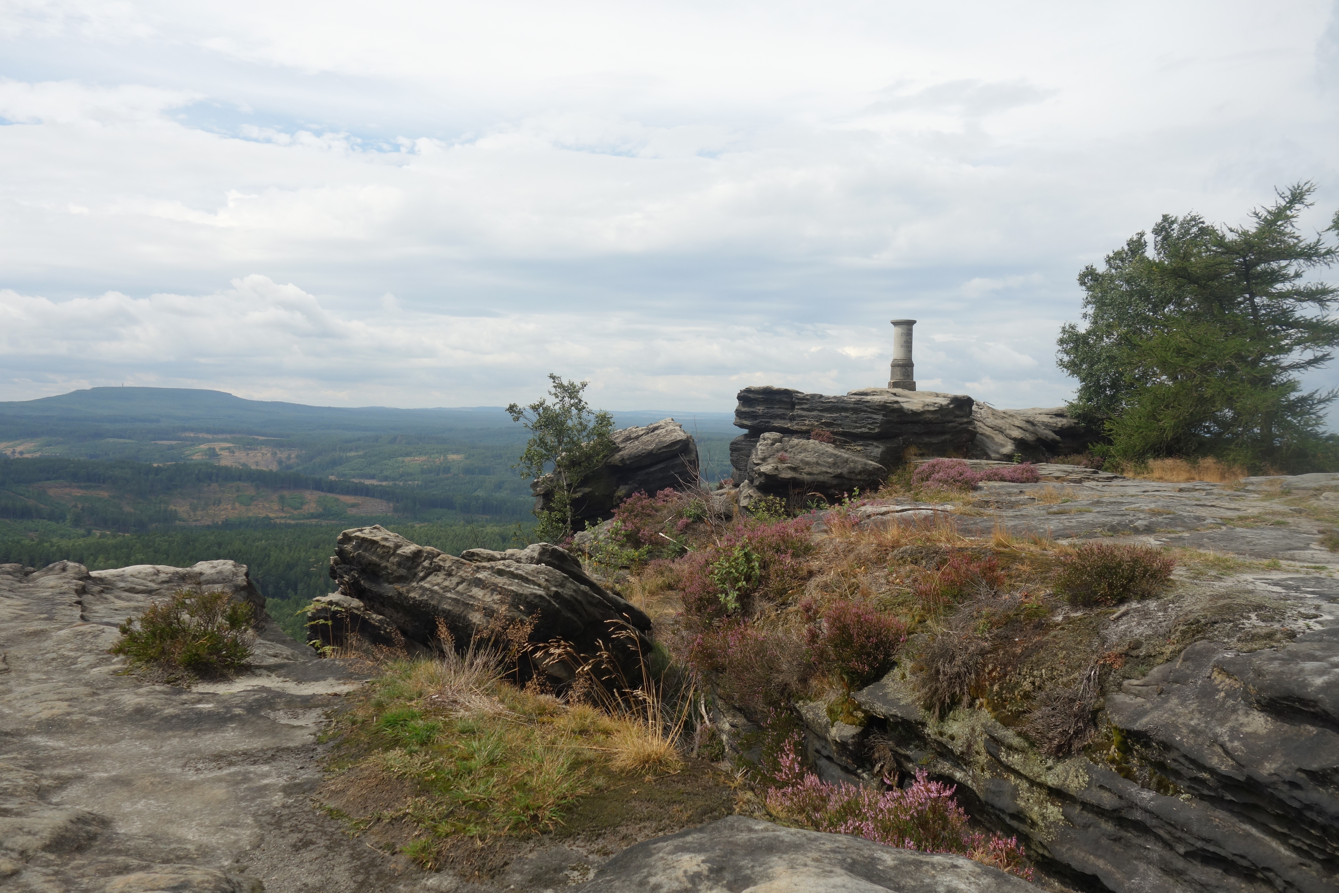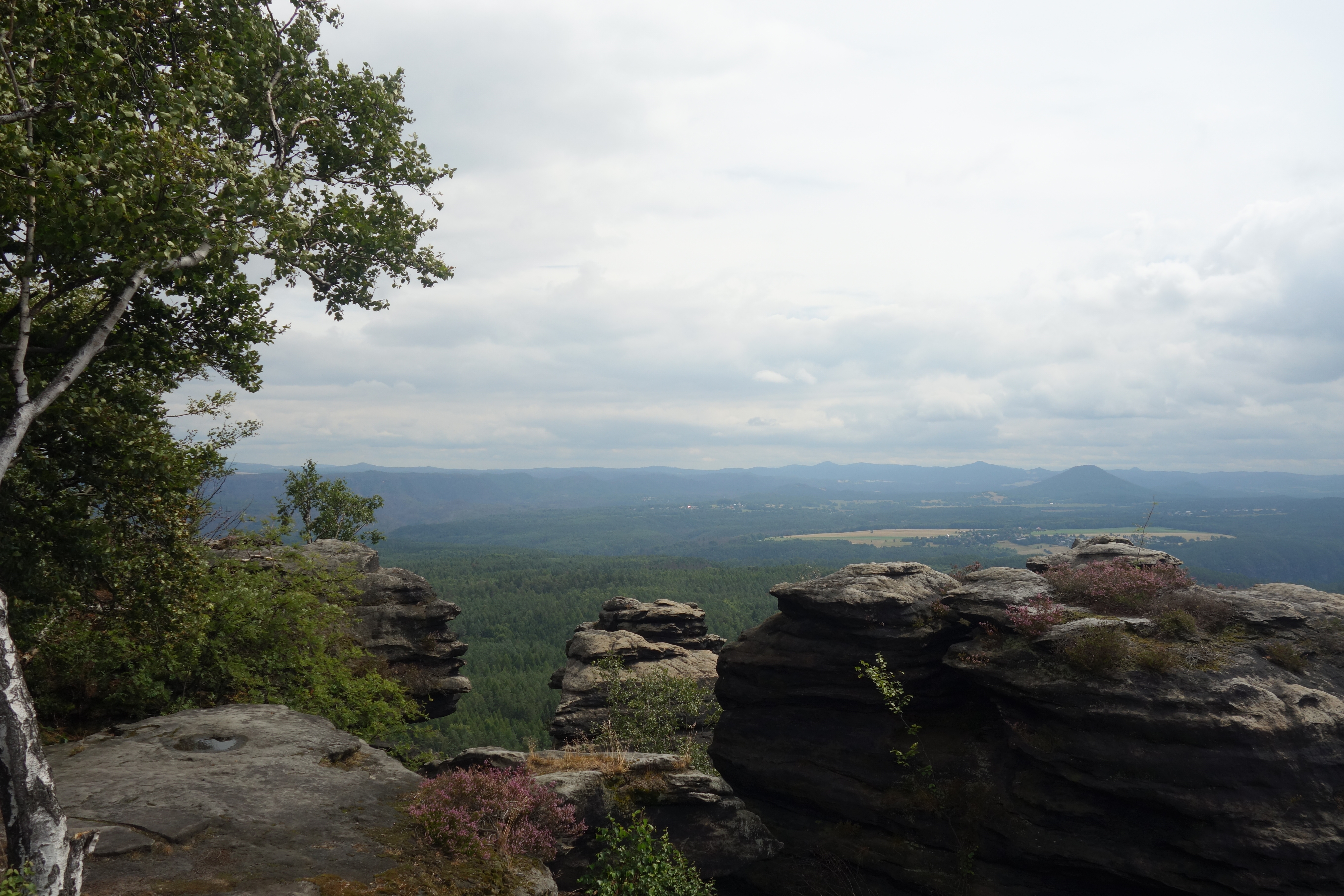 Dat ging doorgaans gestaag. Slechts op enkele stuken werden de trappen en treden bovengehaald. Het was op zich leuk om nog eens ‘artisanaal’ te stijgen en te dalen, een pad zoekend via stenen en boomwortels. Na een goed half uur kwamen we uiteindelijk aan op de Großer Zschirnstein (561 meter). De uitzichten waren hier heel anders dan deze van de voorbije dagen, met vooral veel bossen en de hogere Boheemse toppen in de verte.