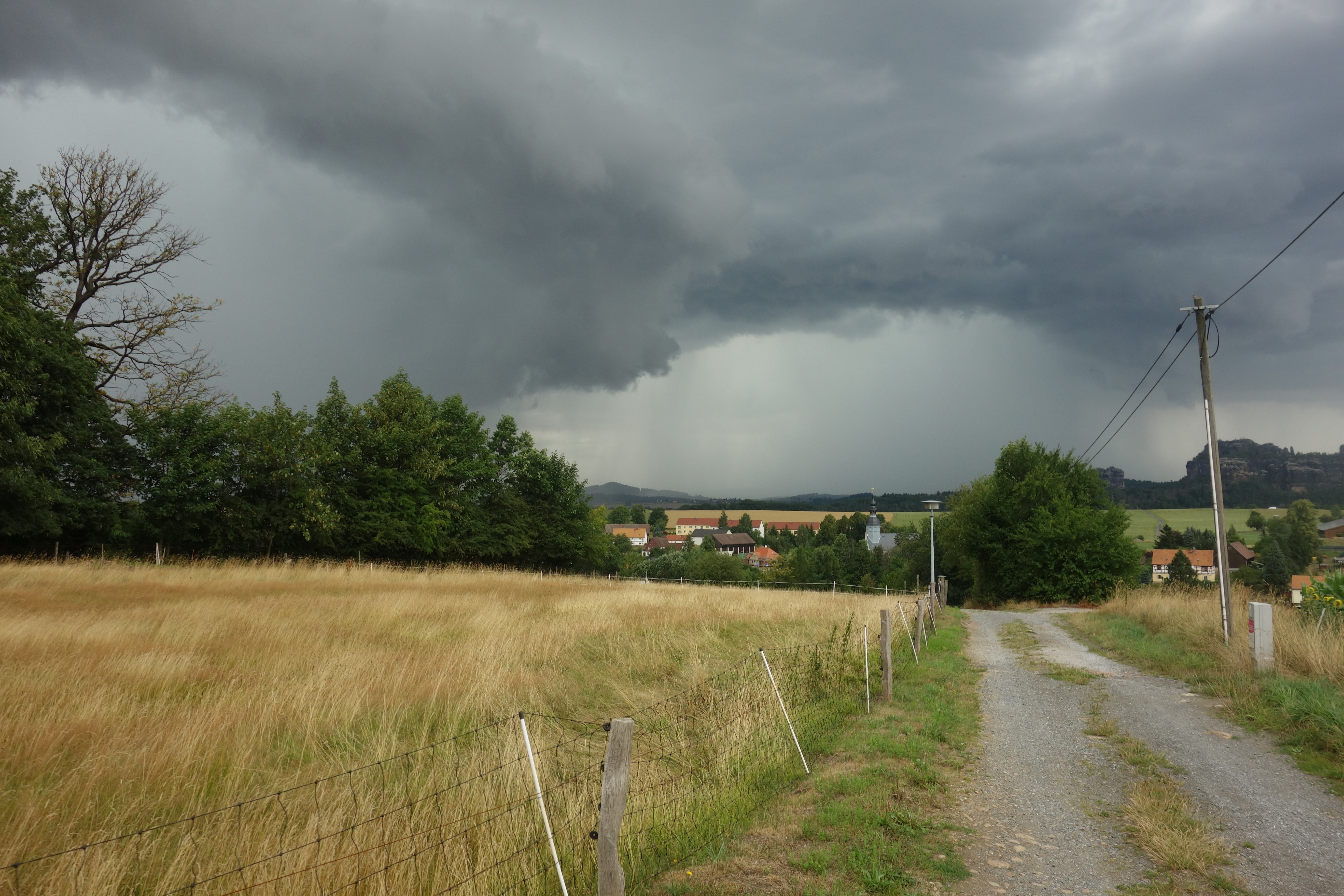 Aan de “voet” van de Wolfsberg vonden we een leuk bankje om te picknicken. Gaandeweg begon het echter te overtrekken. Tot we het plots in de verte hoorden rommelen. We besloten naar Reinhardtsdorf te wandelen, in de hoop daar een café te vinden om eventueel te schuilen. Zonder succes. Ondertussen zagen we in de verte bliksem en regen.
