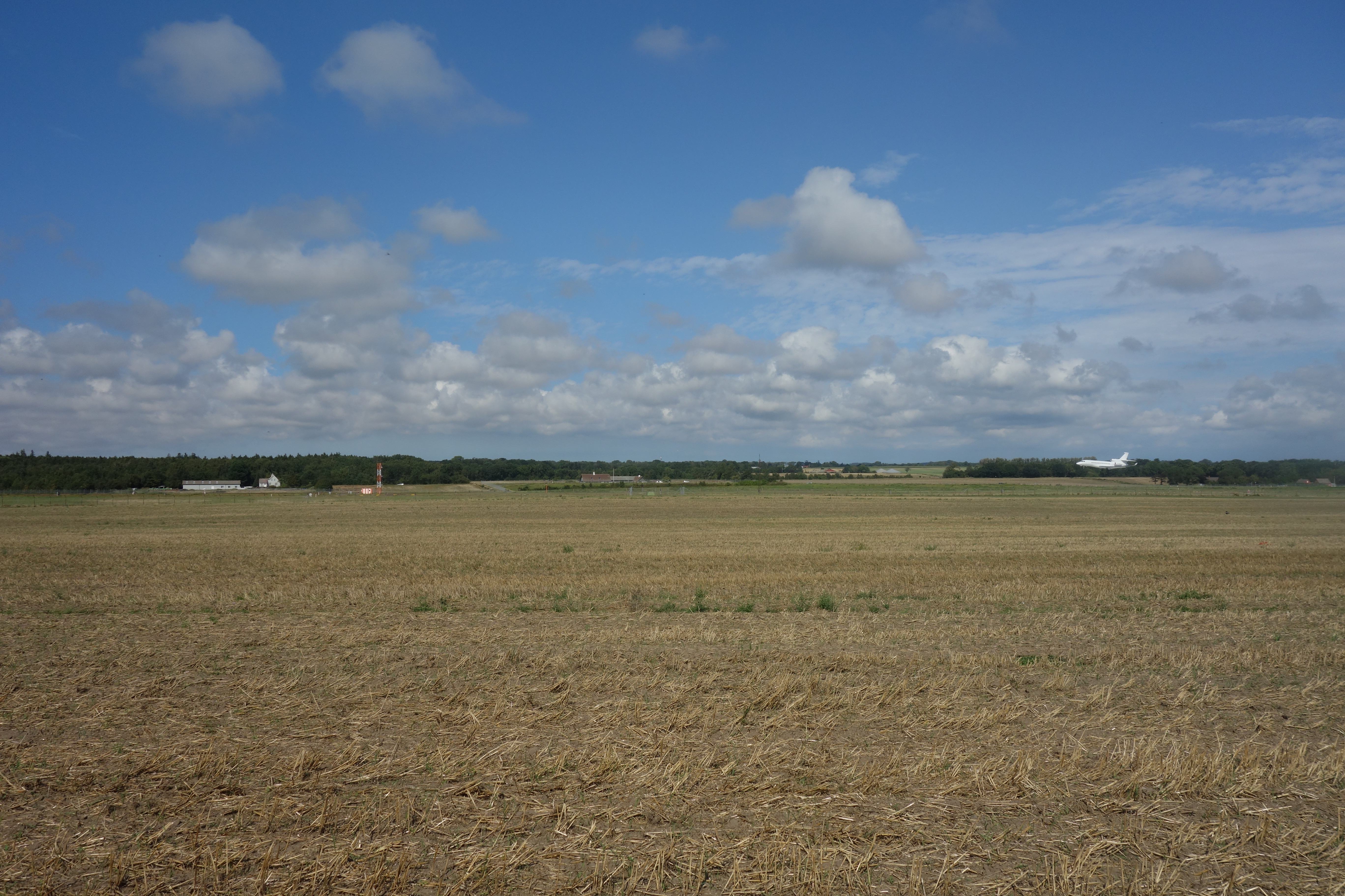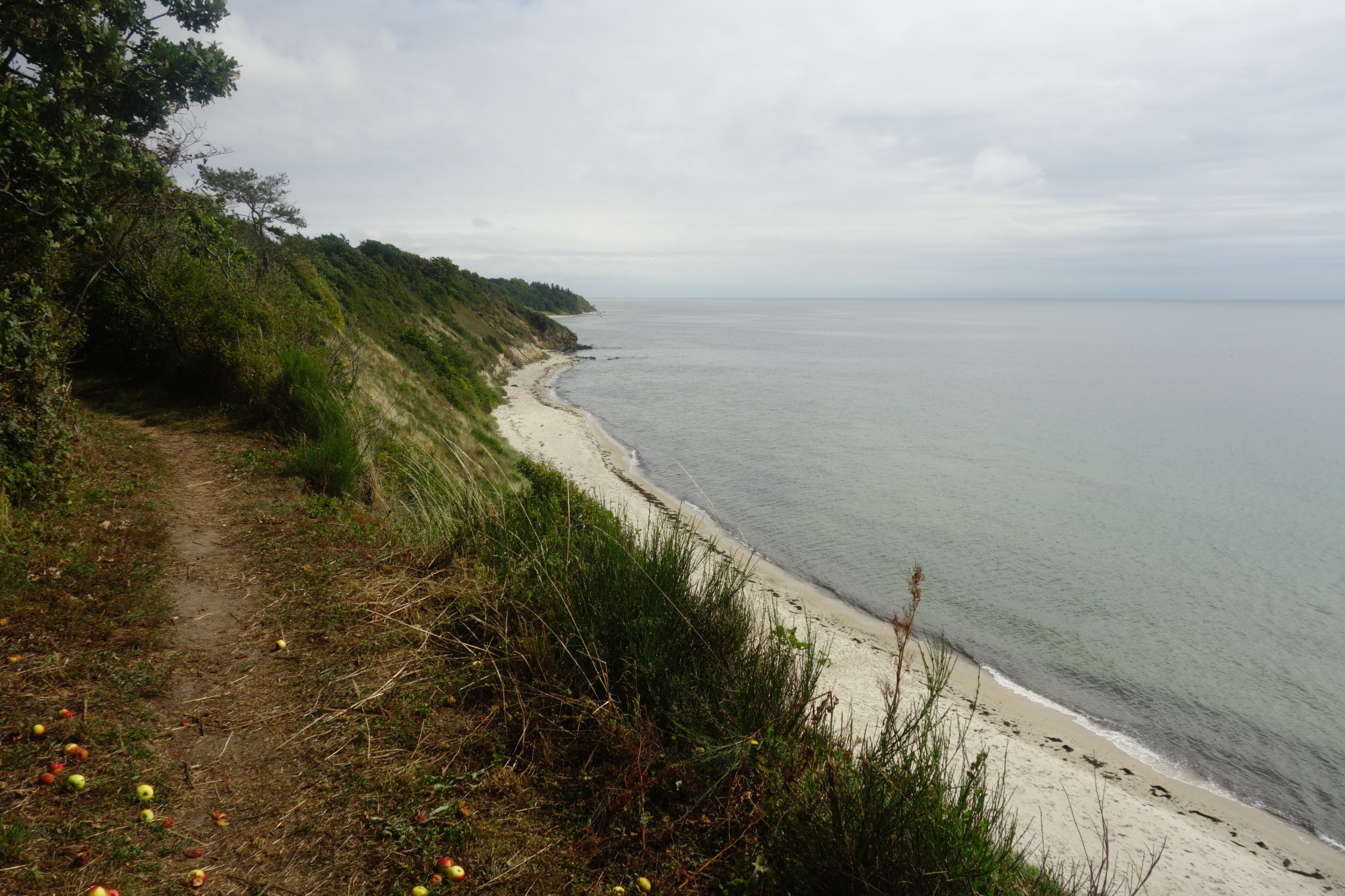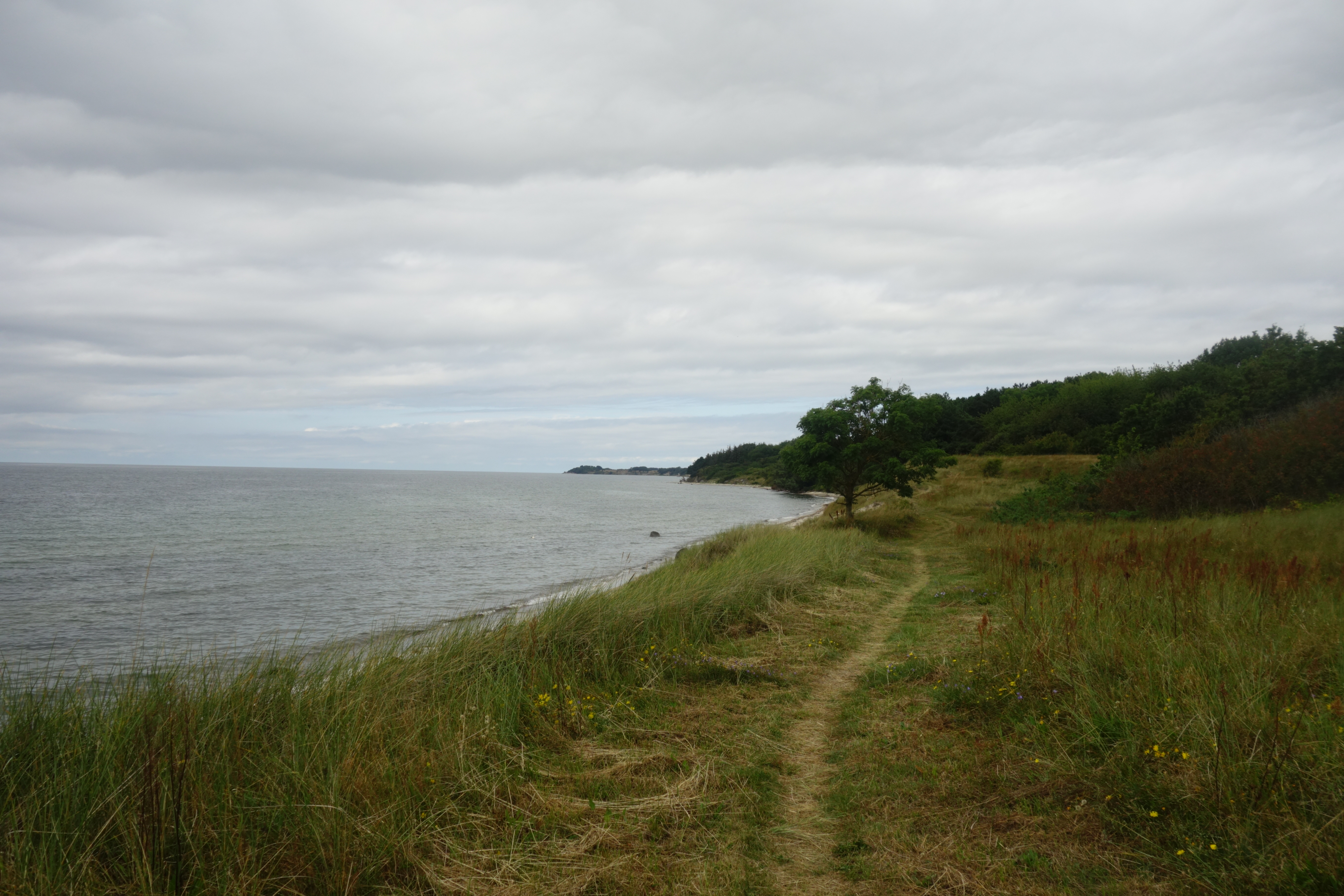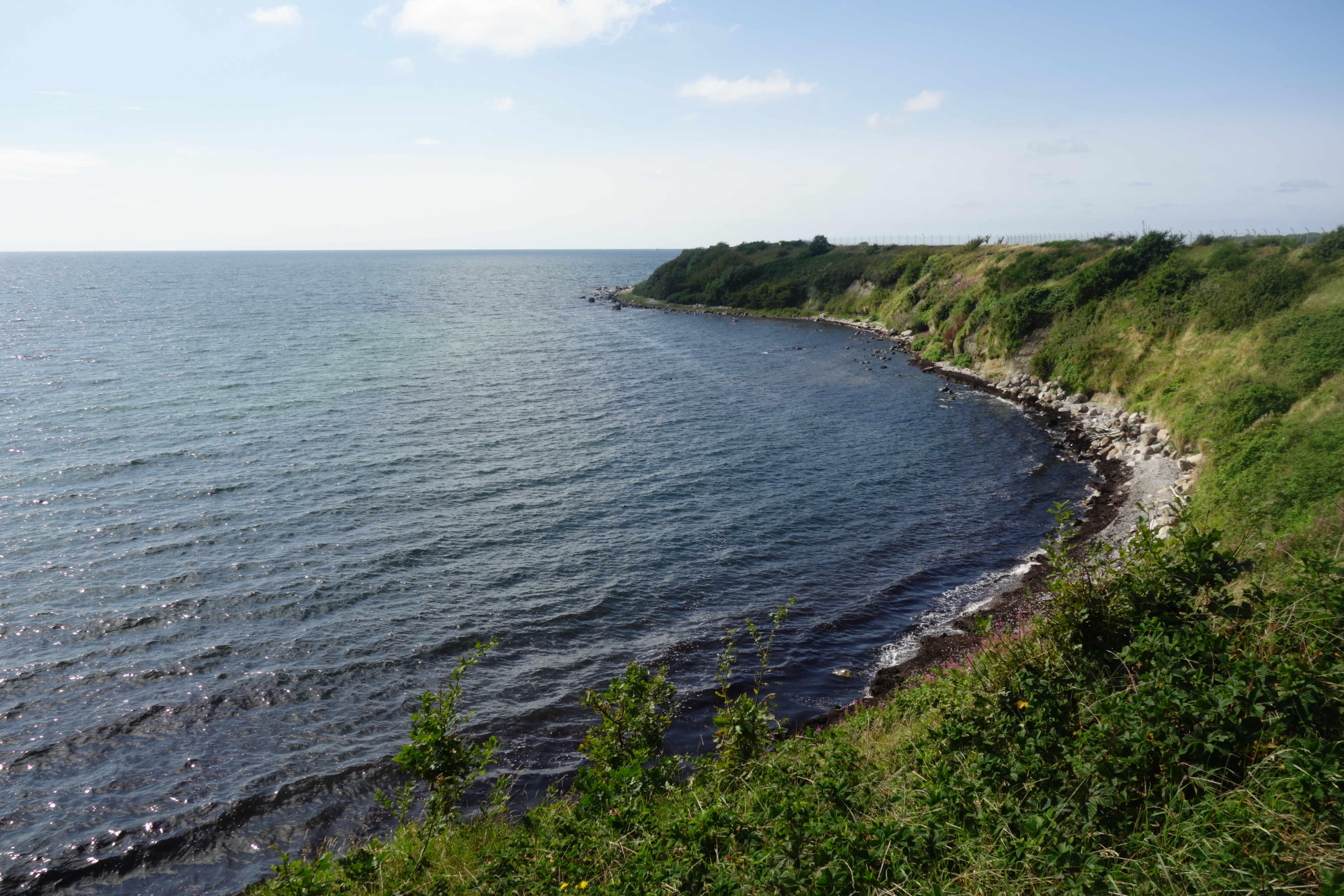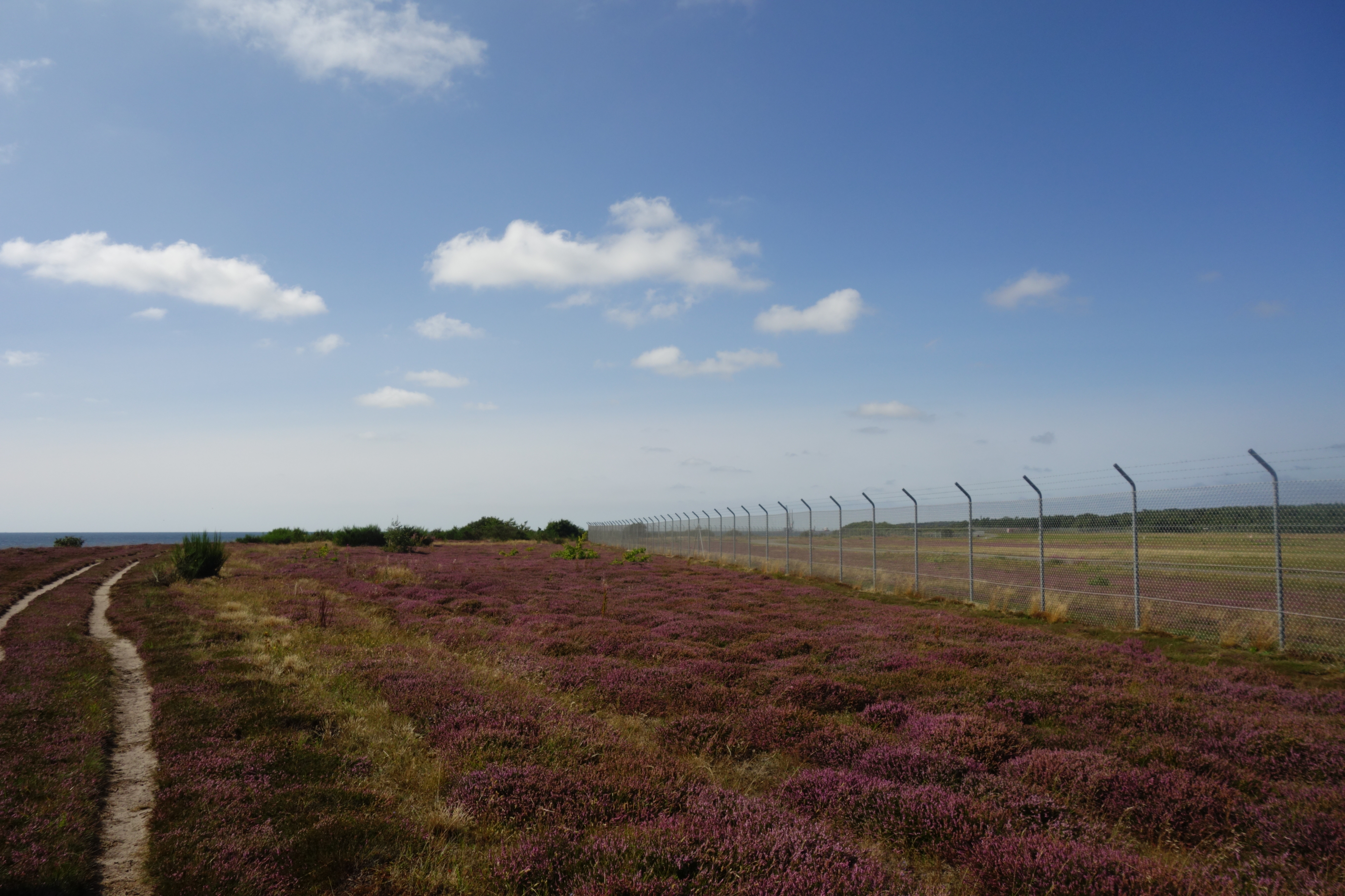 We zaten hier net over de helft en moesten nog 9,2 kilometer afleggen. Een nieuw, lang graspad voerde naar de luchthaven van Bornholm, waar we toevallig een vliegtuig zagen landen. Af en toe viel onze blik op het smalle pad beneden, langs de zee, waar het pad vroeger liep, maar vervangen was door het comfortabele maar wat eentonige pad langs de omheining van de kleine luchthaven, al is er hier nog wel wat mooie heide.