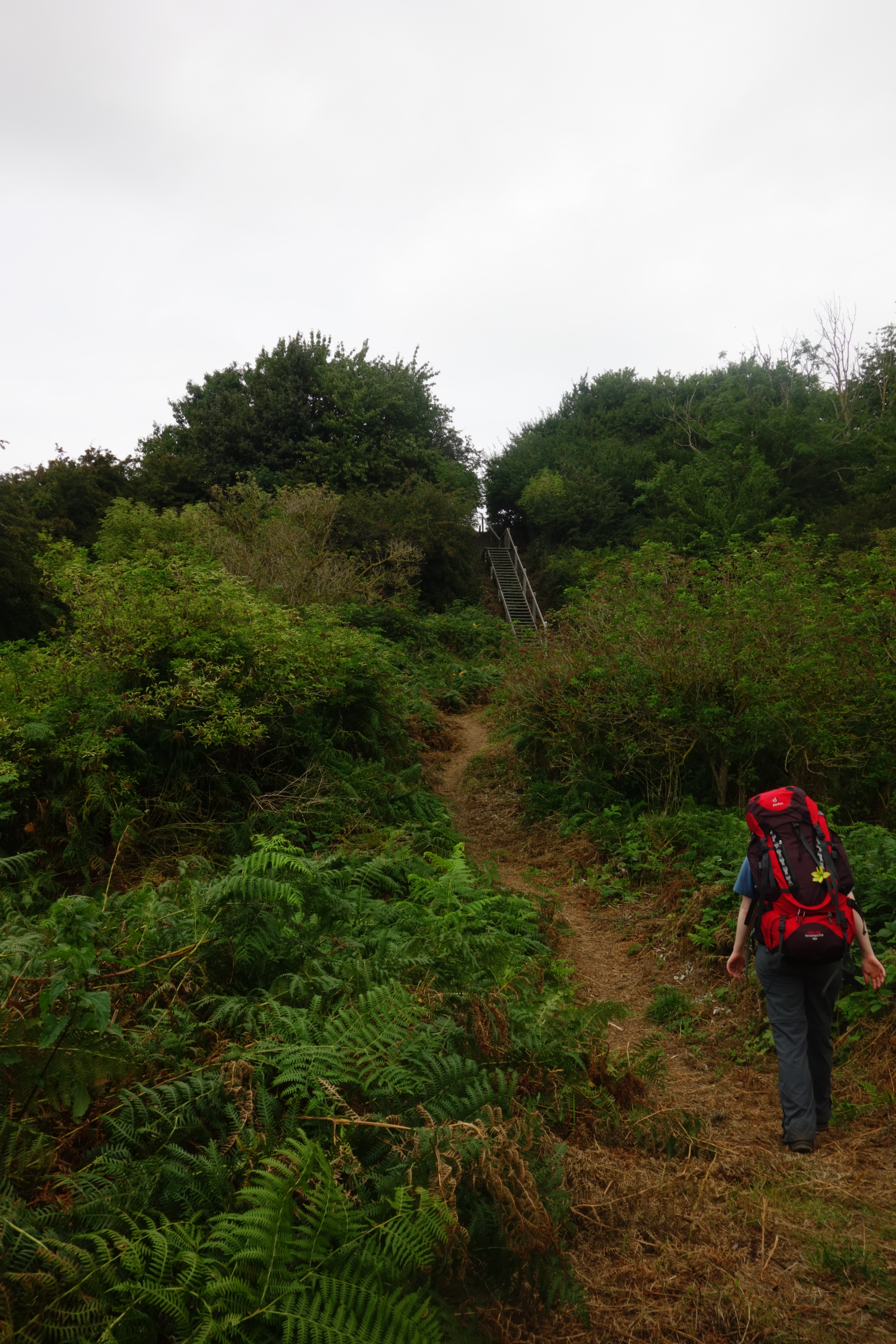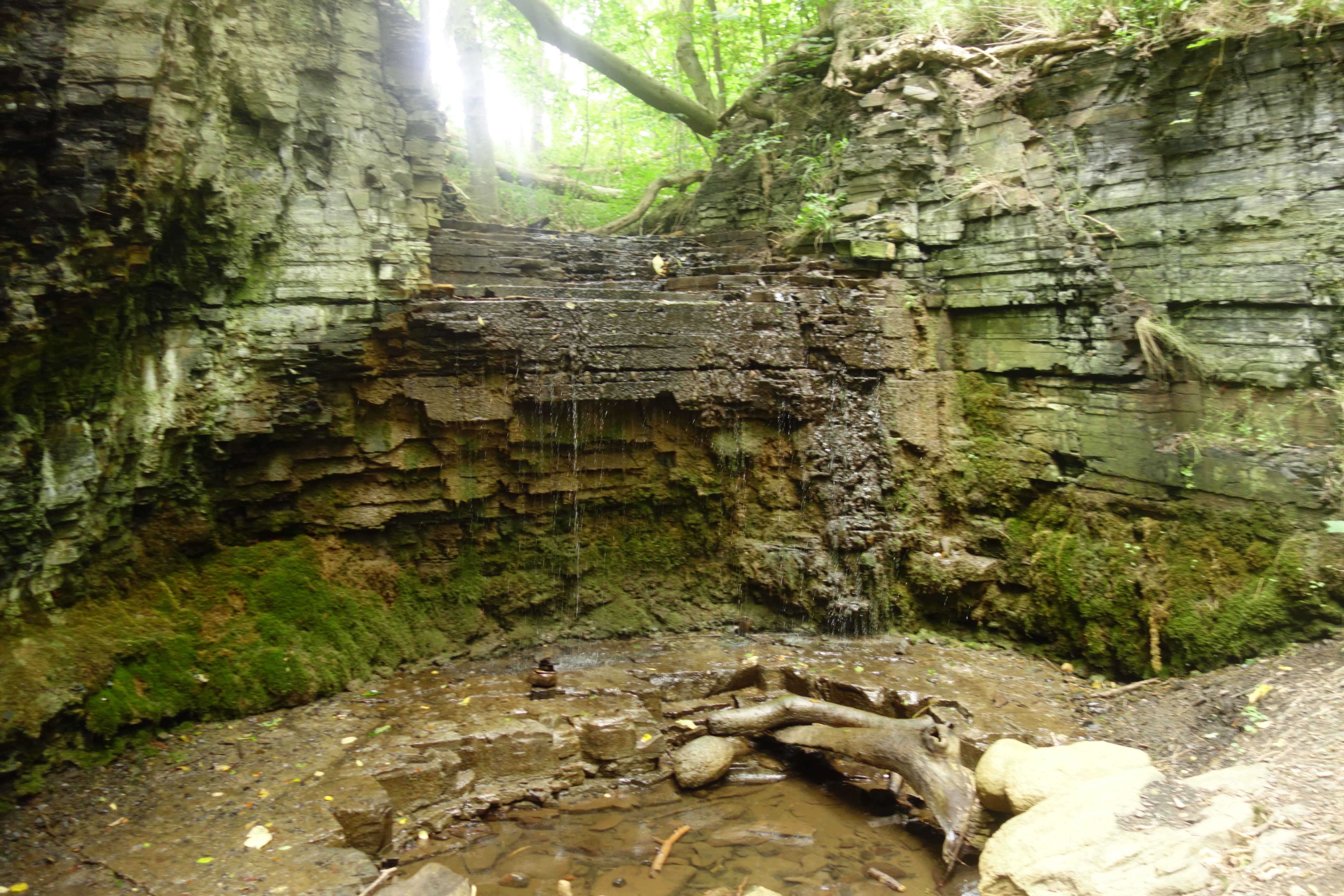 Na een wat later ontbijt en een succesvolle busrit, konden we om 11u30 aan de laatste wandeldag beginnen. Vanaf de kleine haven van Boderne begon een onverwacht pittige eerste vijf kilometer waarin het continu op en neer ging en duin- en bospadjes best grillig waren. Af en toe werden we ook op en af nogal grote, steile houten trappen gestuurd, niet zelden om een kort stukje strand te doen. Hier zagen we wel onze eerste waterval(letje), de rode, die wel niet echt rood was. Maar goed, de vorige watervallen waren volledig opgedroogd.