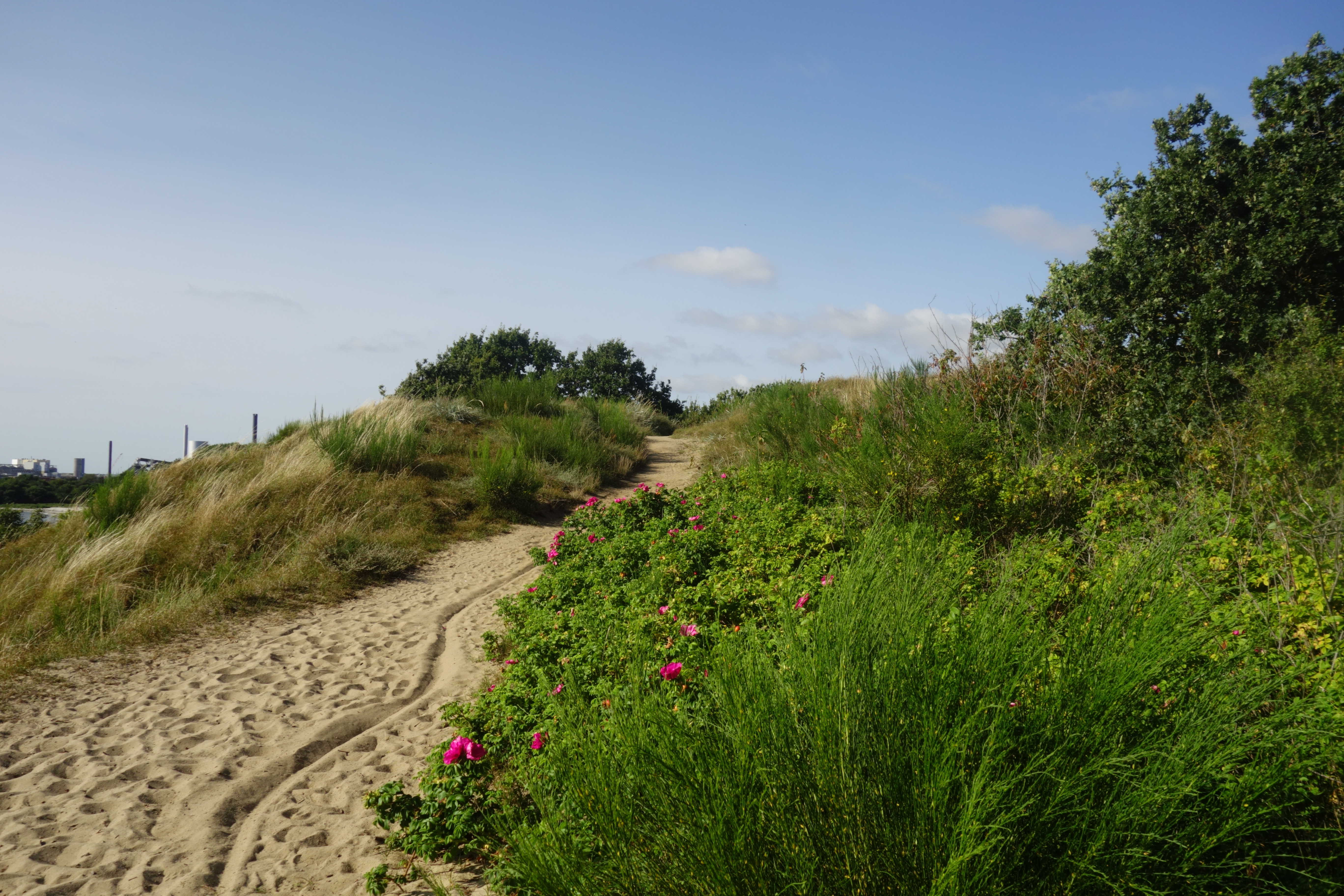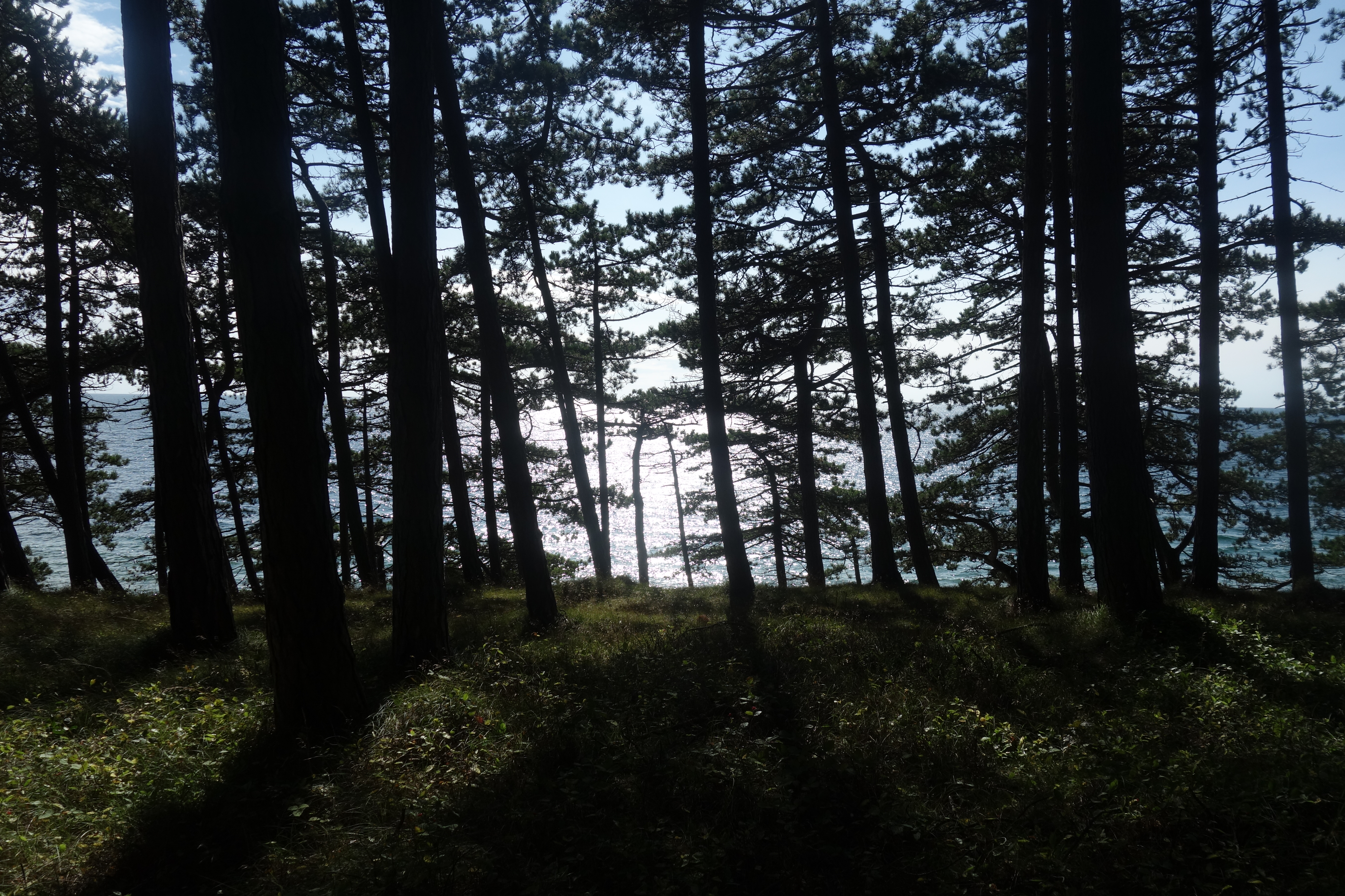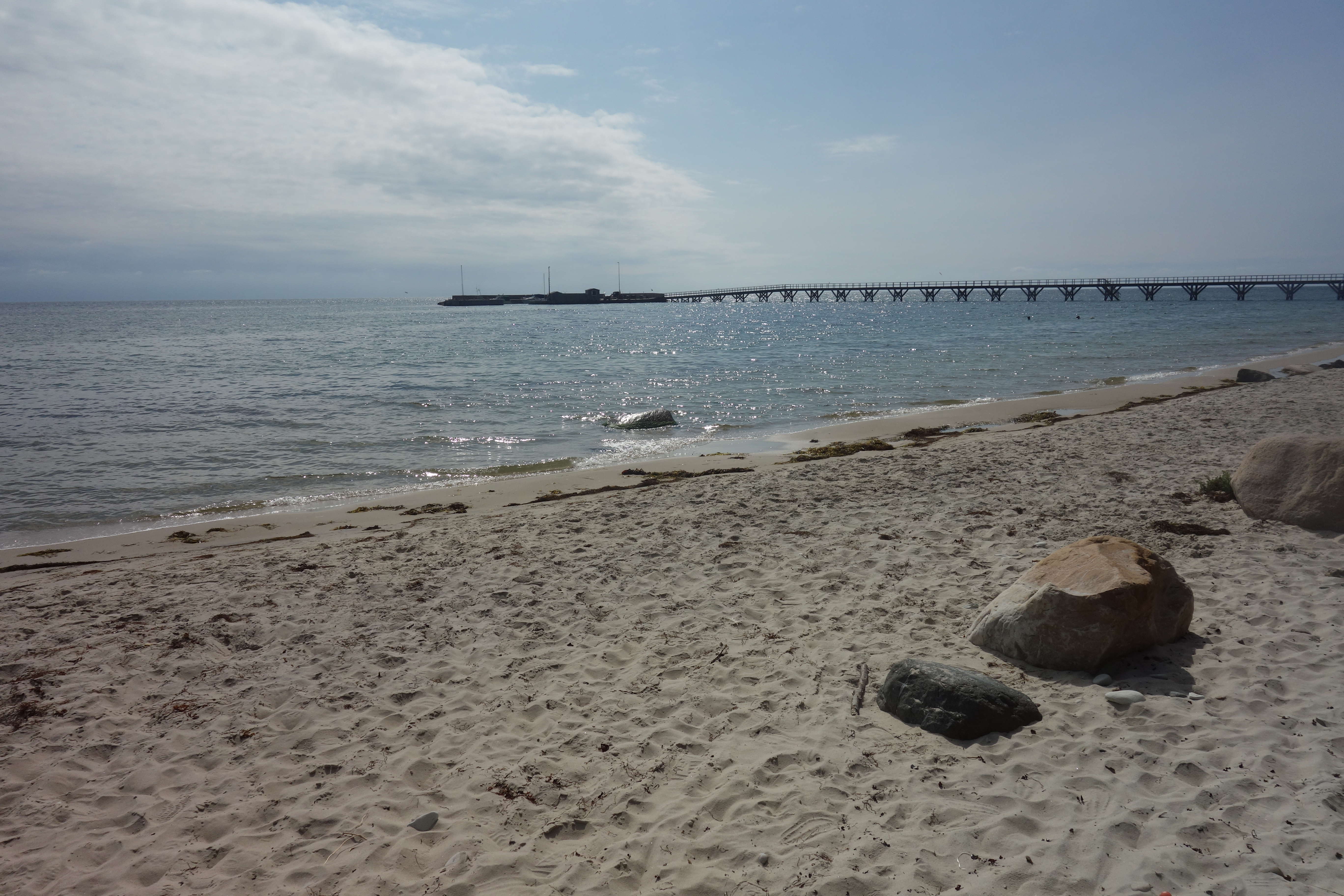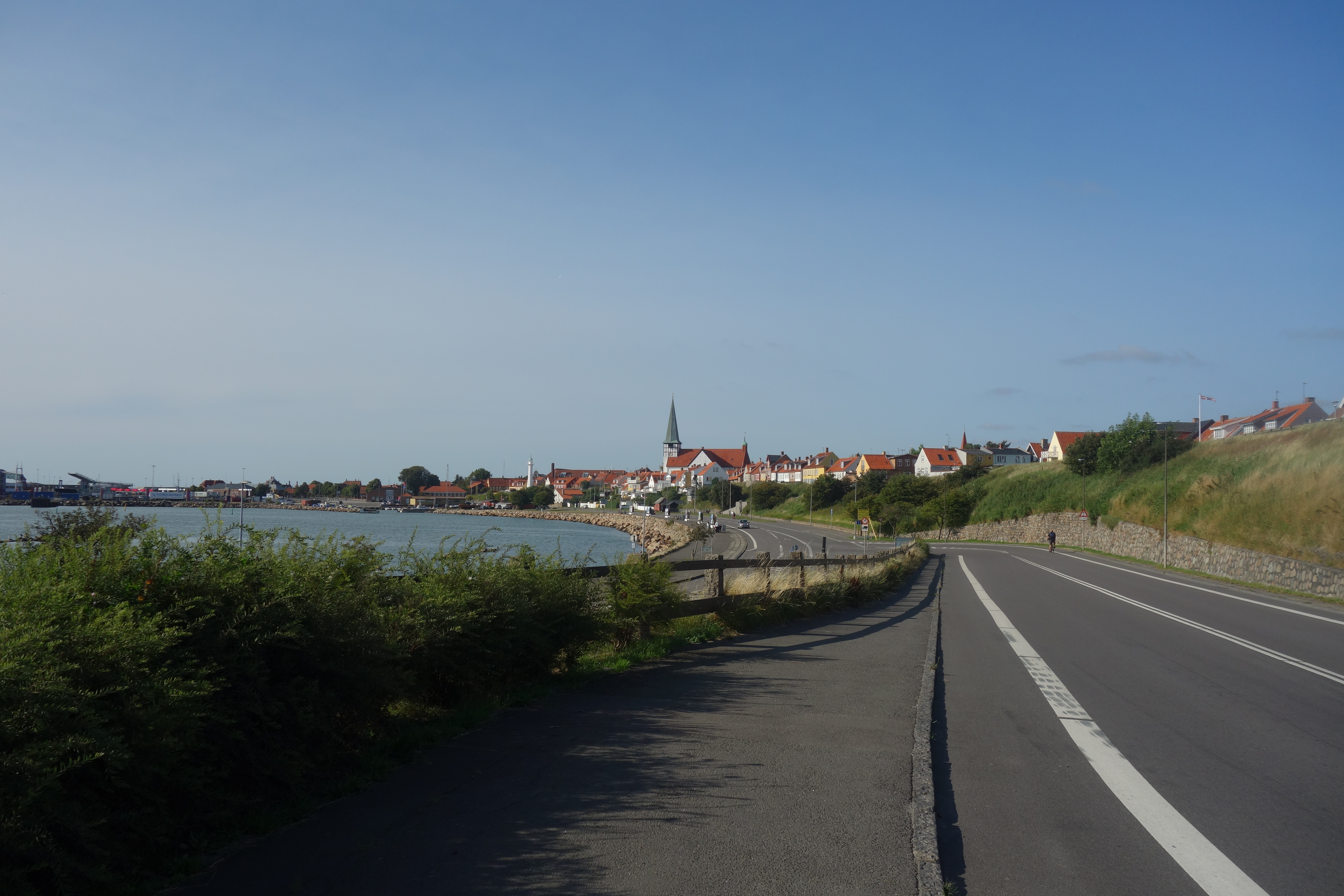 Eens hier gepasseerd was er een al even eenzijdig stuk langs ettelijke vakantiehuisjes en door een bos, waarna zowel het strand als de haven van Rønne vanaf het pad te zien was. Het was nog een mooie laatste kilometer van de Kyststi. Zo kwamen we opnieuw op het startpunt aan, met zicht op de mooie witte kerk en vuurtoren.