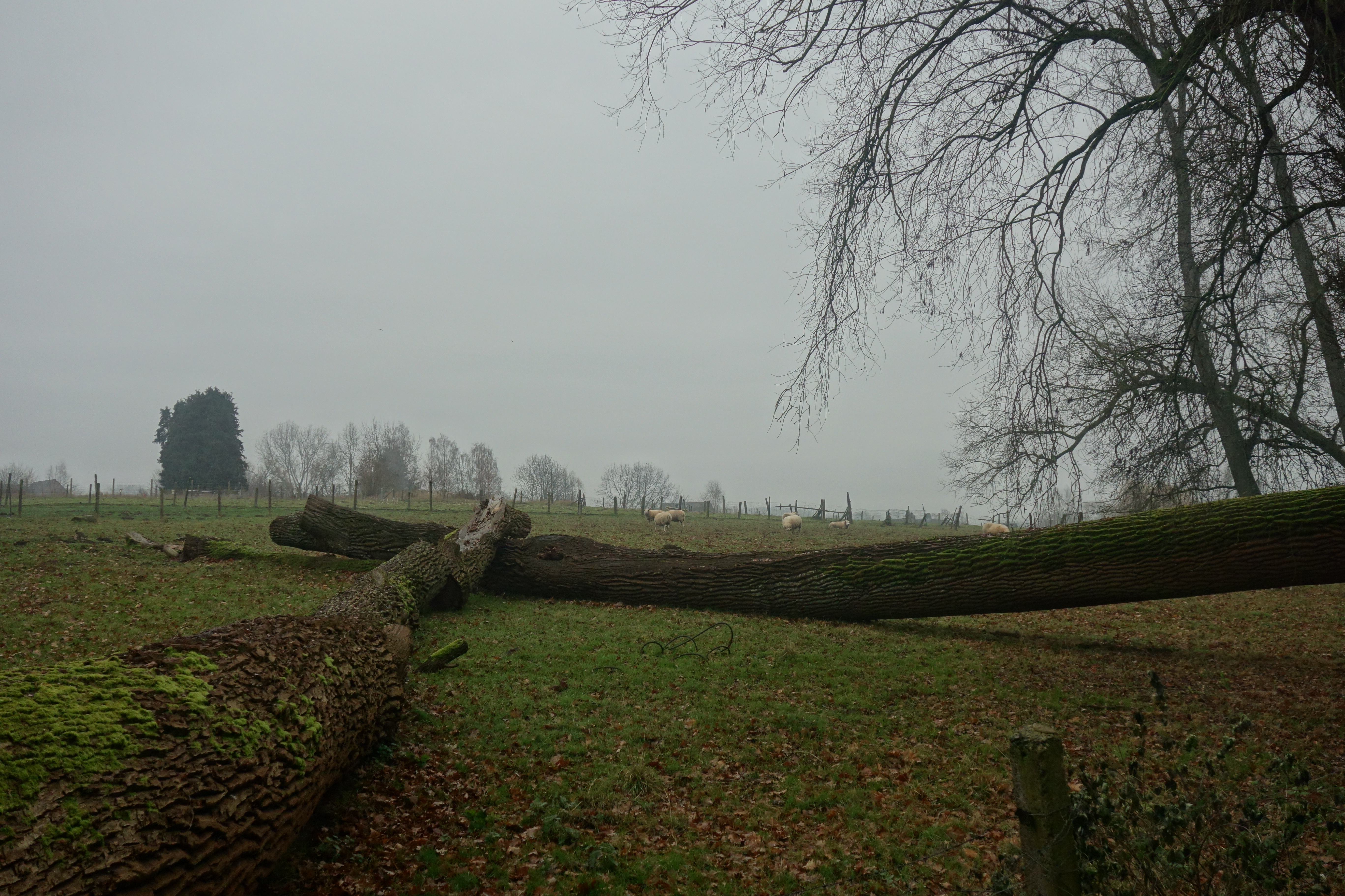 Eens het bos in volgde we opnieuw een stuk dat we ook al hadden gedaan op ons oorspronkelijk wandelproject, de StreekGR Groene Gordel, dat we toen in de omgekeerde richting tussen Mollem en Sint-Kwintens-Lennik aflegden. Vandaag ging het echter noordwaarts en waren de weersomstandigheden ook anders. Hier, in de winter, is het kale bos best wat troosteloos. Gelukkig waren de stammen breed genoeg voor een welgekomen en noodzakelijke plaspauze.