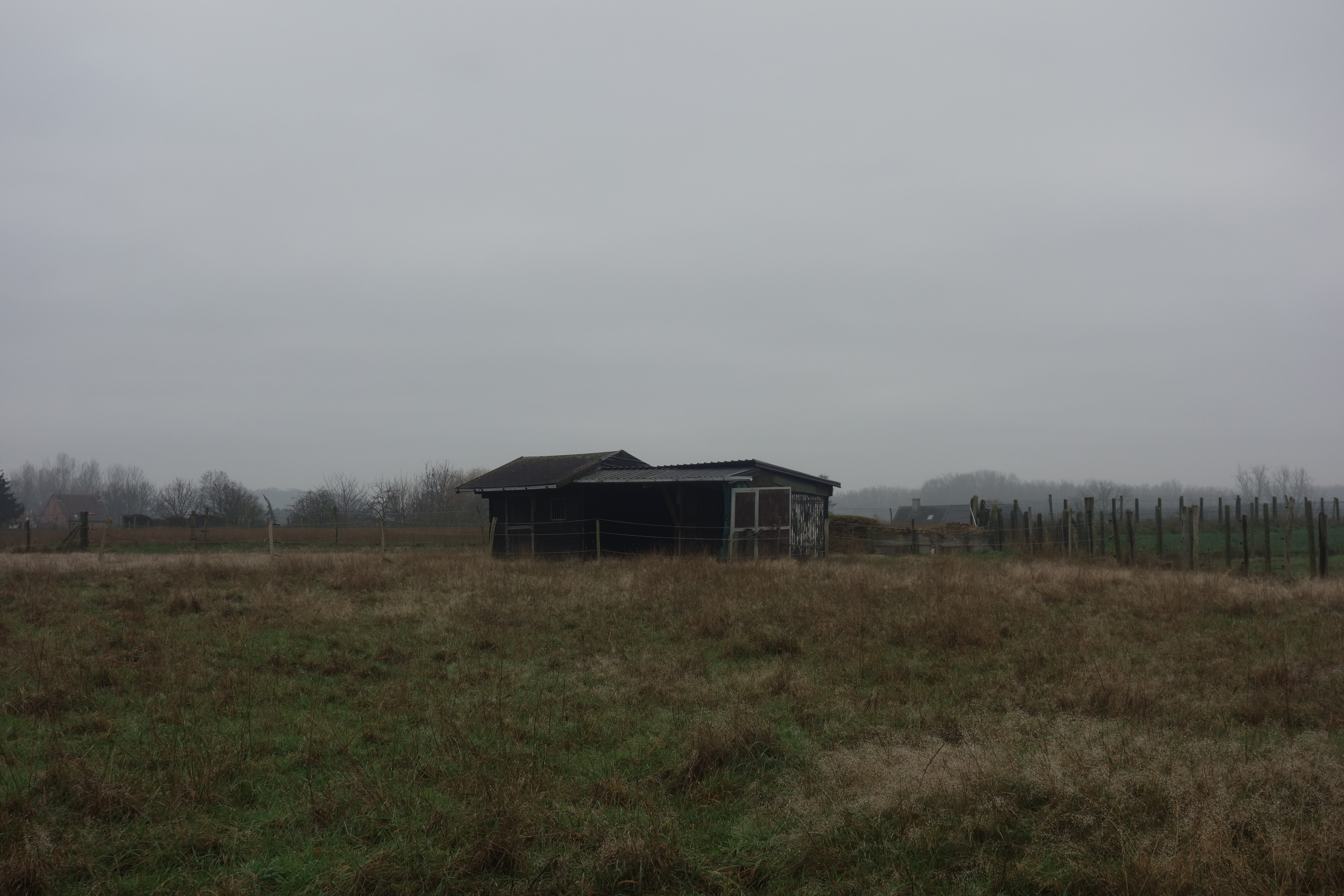 Zo waren er nog enkele willekeurige gebouwen die de wandeling kleurden. Aan de schuur was in de verte, door de lichte mist, de kerk van Meldert te zien. Iets verder was er opnieuw een verlaten en verloederde schuur. En niet veel later passeerden we de Koninkrijkszaal van Jehovah’s Getuigen in Asse, wat vooral uitblonk in z’n onopvallendheid en troosteloosheid.