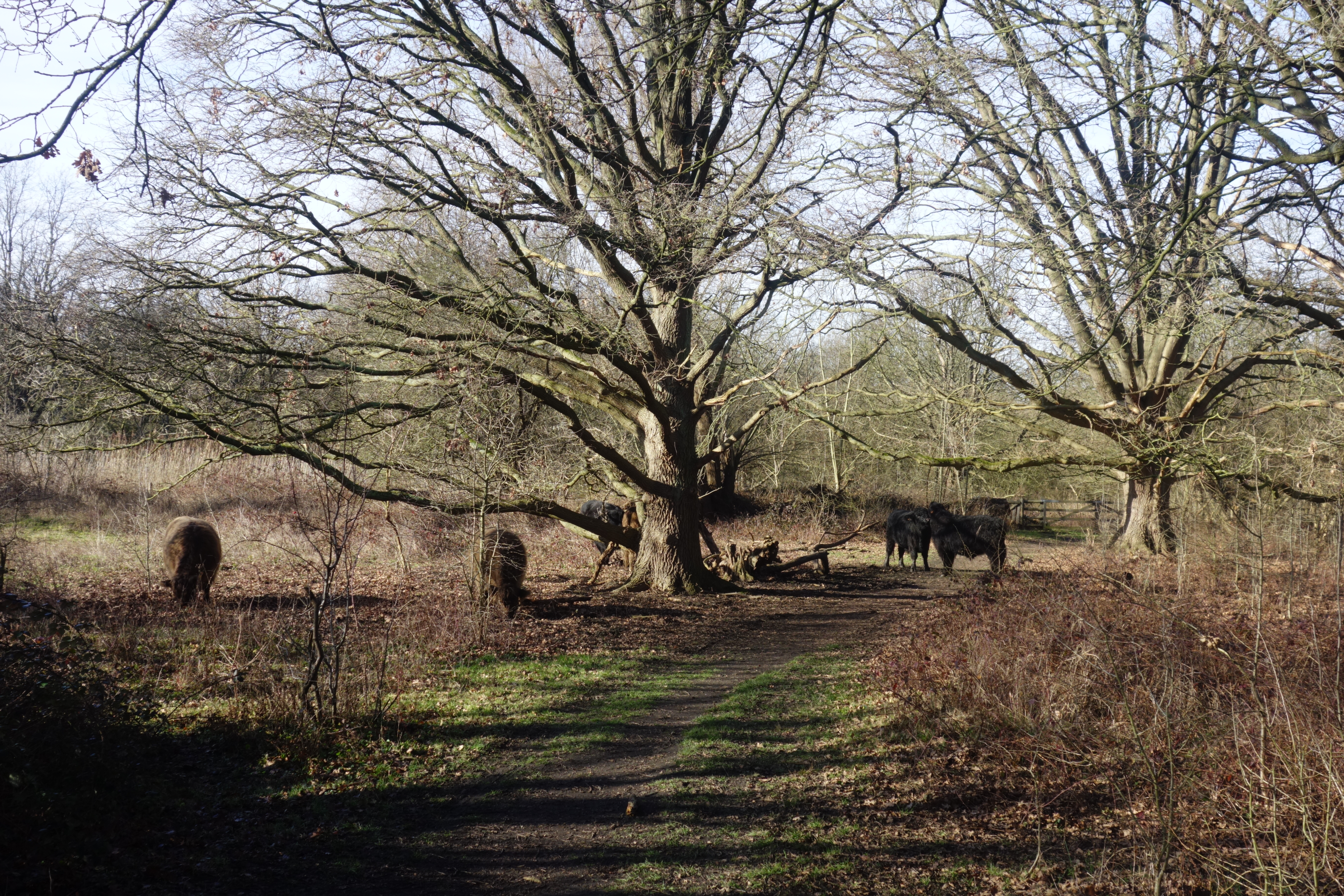 De gevreesde confrontatie met wilde, psychopathische koeien bleef gelukkig uit. De Galloways stonden op een veilige afstand, verzameld rond een van de vele indrukwekkende, kale bomen. Het middaguur was inmiddels aangebroken en dus was een uitnodigend bankje de ideale plek voor onze lunch. Niet veel later was dit stukje natuur, goed voor anderhalve kilometer, al gedaan.