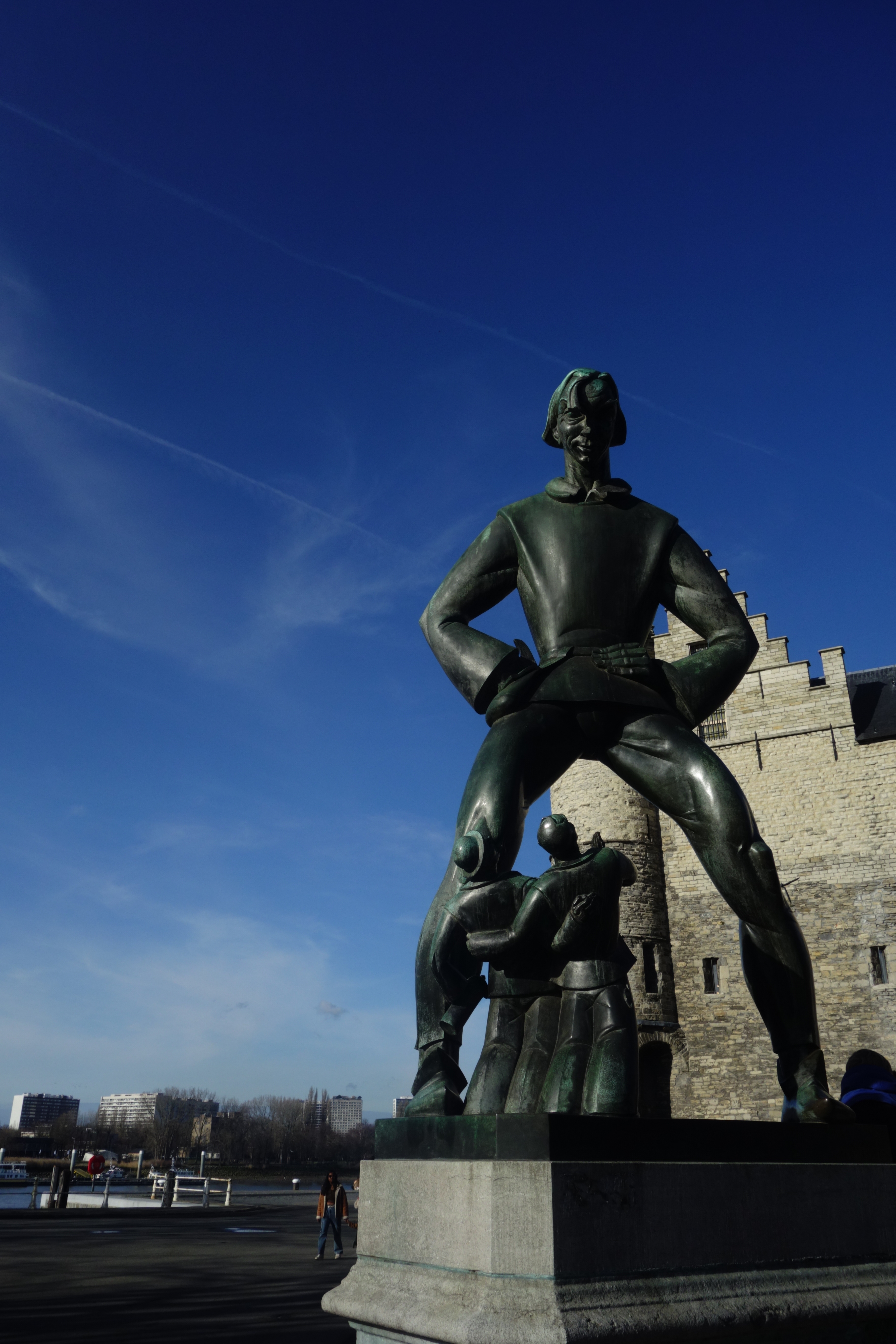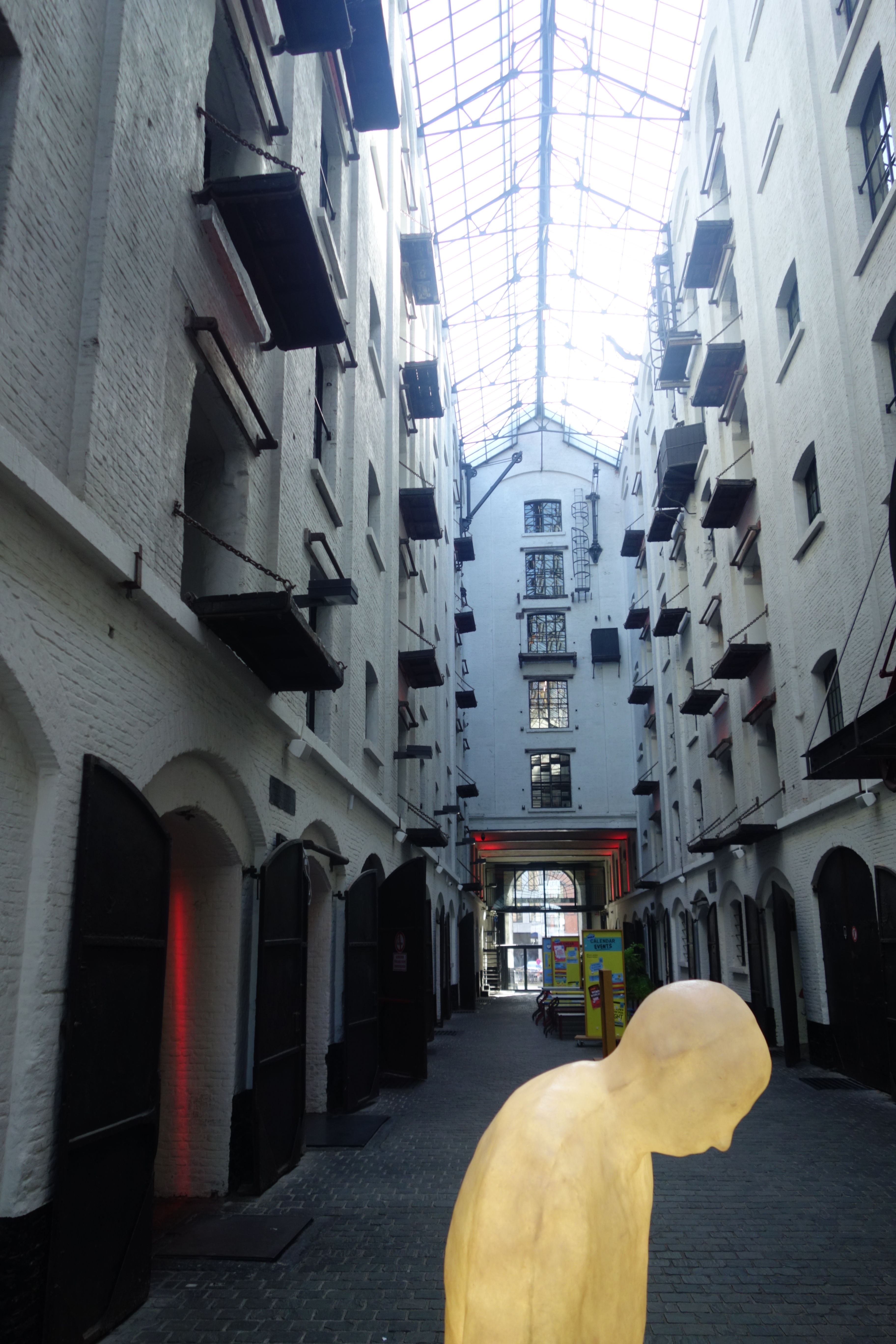 De volgende tussenstop was het Museum aan de Stroom of het MAS. Het hoofddoel van dit bezoek was geen tentoonstelling en zelfs geen bezoek aan het dakterras met zicht op de stad. Er was een bic uitgelopen in de zak van mijn fleece en achteloos had ik in Luchtbal mijn hand in mijn zak gestoken, met blauw getinte vingers tot gevolg. Gelukkig bracht het stromend water van het MAS redding. Dit tweede deel werd nog vervolgd door een passage door het indrukwekkende Felix Pakhuis en via enkele mooie straten naar het Steen, het oudste bewaarde gebouw van Antwerpen en vandaag de thuis van de dienst toerisme.