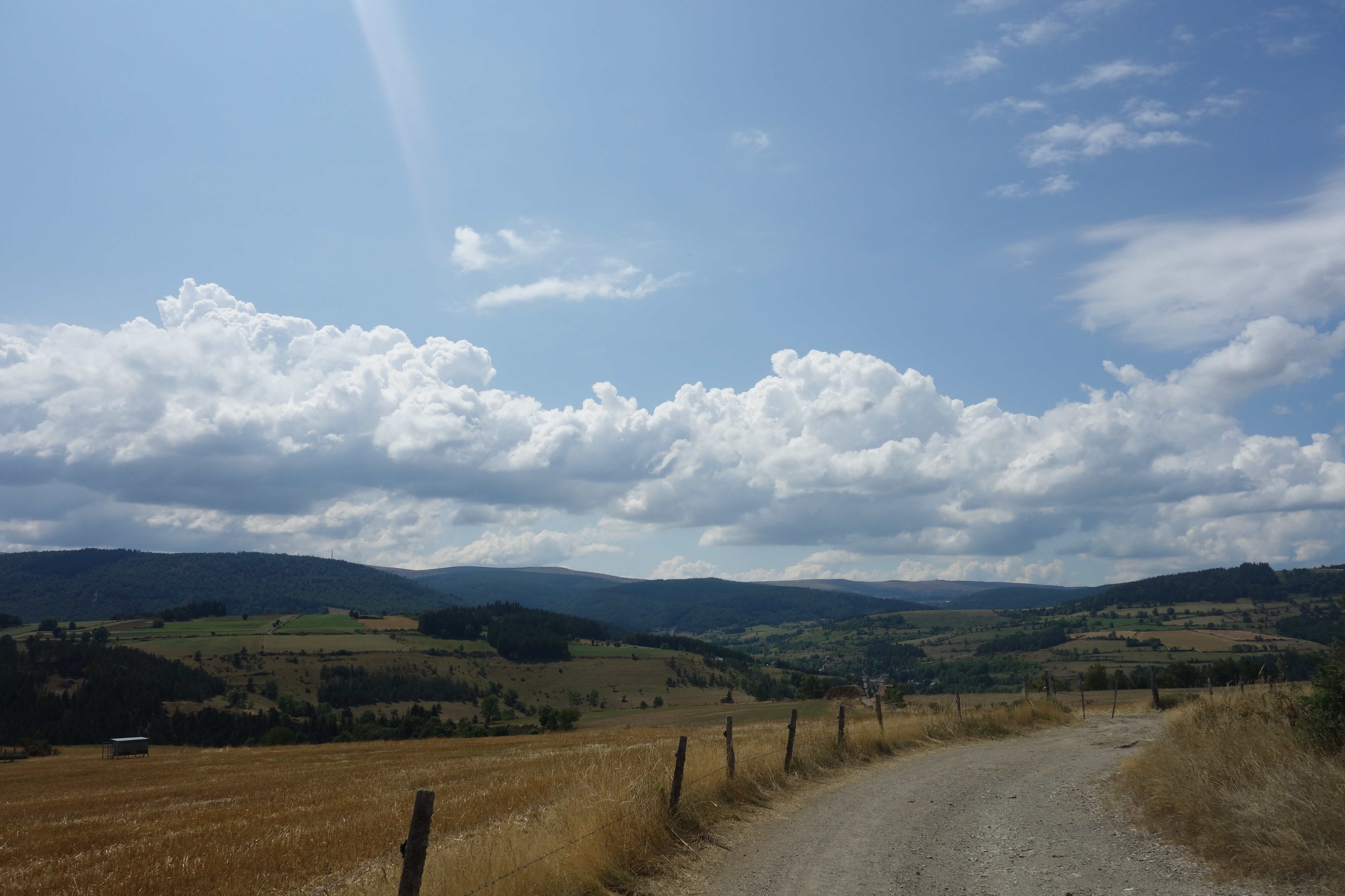 Ons volgende hoogtepunt was Pradelles, maar het vergde nog een goede 9 km eer we daar aankomen. Het landschap is tussendoor weer adembenemend, met vergezichten over de glooiende heuvels. In de verte is het meer van Langogne al zichtbaar, maar eerst moesten we nog een bocht nemen naar een van de mooiste dorpjes van Frankrijk, naar het schijnt, voor we aan de gelijknamige stad komen. Het pad werd ietsje ruiger en we kwamen op het hoogste punt van de dag, de Rocher de la Fagette, op 1265 meter. Van daaruit is het een goede 150 meter dalen naar Pradelles. Vreemd genoeg kwam, toen we onze lunch opaten op een bankje, de man die de verkeerde passage had genomen voorbij gewandeld. Hij zal waarschijnlijk weet hebben gehad van een shortcut, of gewoon veel geluk hebben gehad.