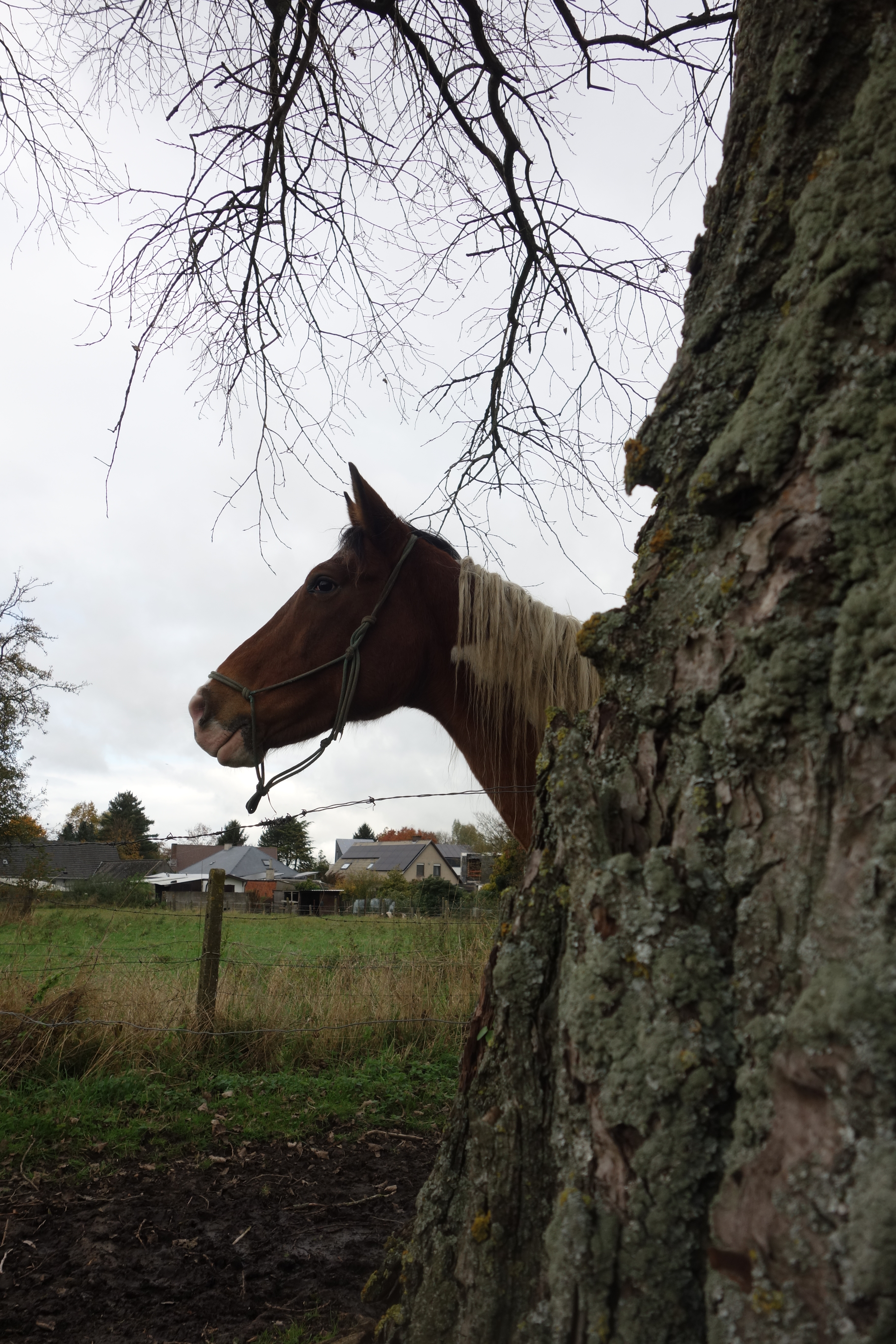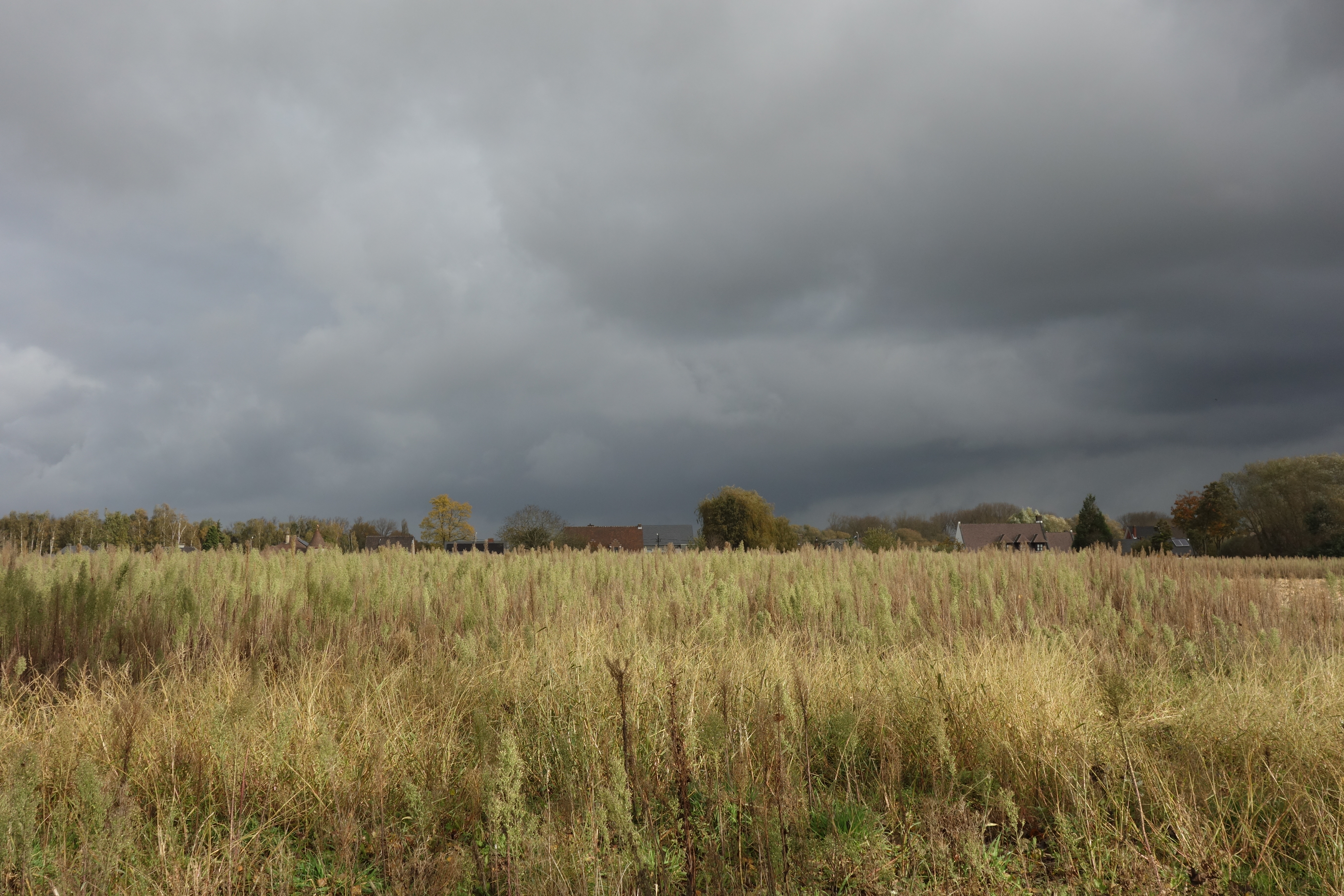 Het laatste stukje natuur werd geserveerd in een mooi stuk door de velden met hoge gewassen en een indrukwekkende boom. En daarmee kwamen we opnieuw in de bebouwde wereld, via de buitenwijk Aalst-Rozen, waar de GR5A richting Aalst-centrum trok en de GR 128 de andere kant koos. Wij namen dus het fietspad langs achtertuinen, met enkele agressieve chihuahuaβs, en vervolgens een fietspad waar het continu uitwijken was voor de fietsers die uit beide kanten kwamen. Eindigen deden we met een kort stukje met zicht op de skyline van Moorsel, bijna zo indrukwekkend als deze van Wetteren. En daar, vlakbij de kapel, de kerk en het waterkasteel, namen we de bus naar Aalst en vervolgens naar Oudegem, na een wandeletappe die heel anders was verlopen, maar opnieuw veel te bieden had.