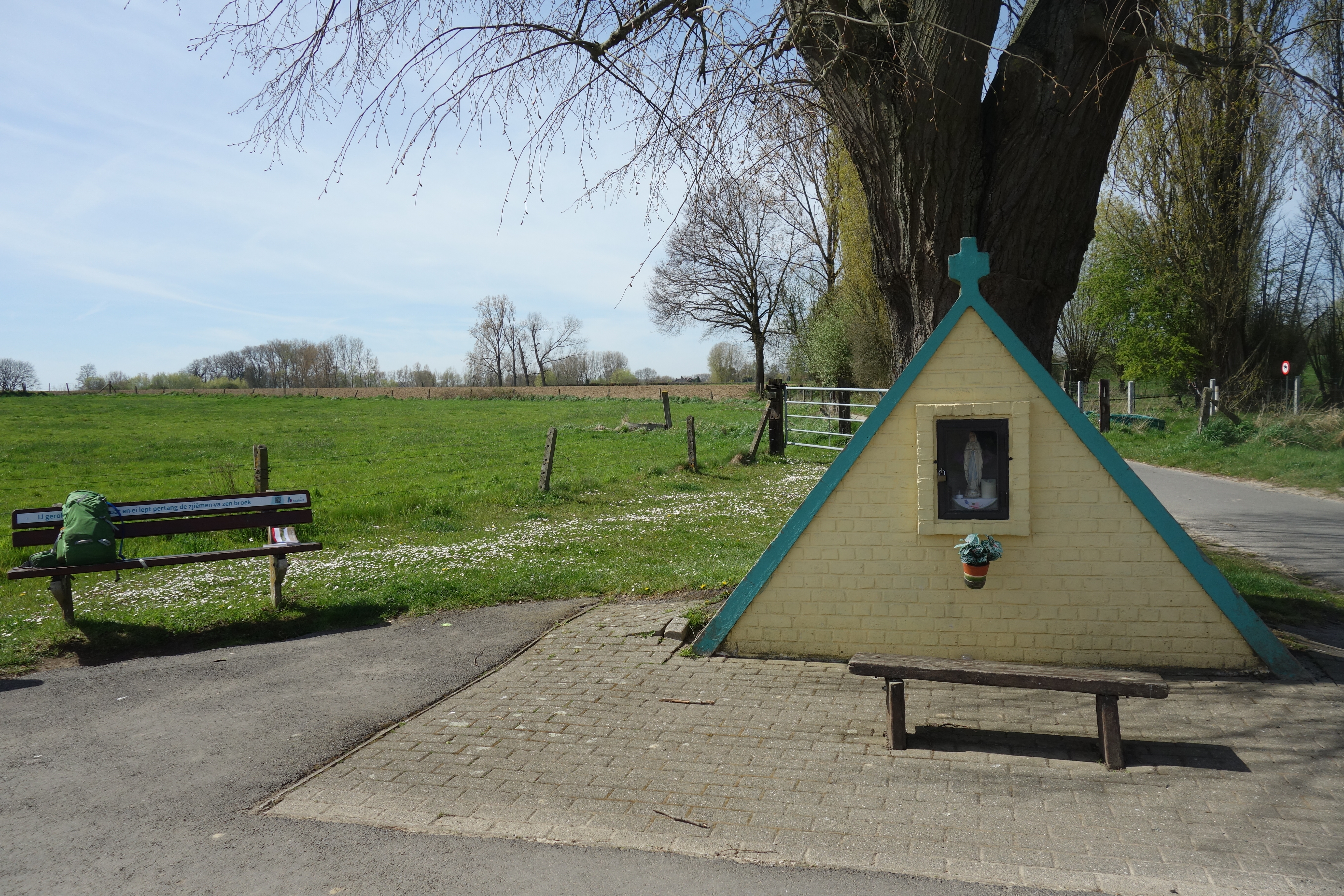 Daarna volgde een stukje graspad door de weiden. We zagen al sinds enkele etappes af en toe het symbool van de Sint-Martinusroute opduiken, waarbij we verkeerdelijk dachten dat dit een lokale wandelroute was. Omdat we het ook vandaag weer her en der zagen, besloten we het op te zoeken. Tot onze grote verbazing blijkt het een volwaardige wandelroute van maar liefst 420 kilometer tussen Utrecht en Tours te zijn. Het kan zo op de bucketlist.
