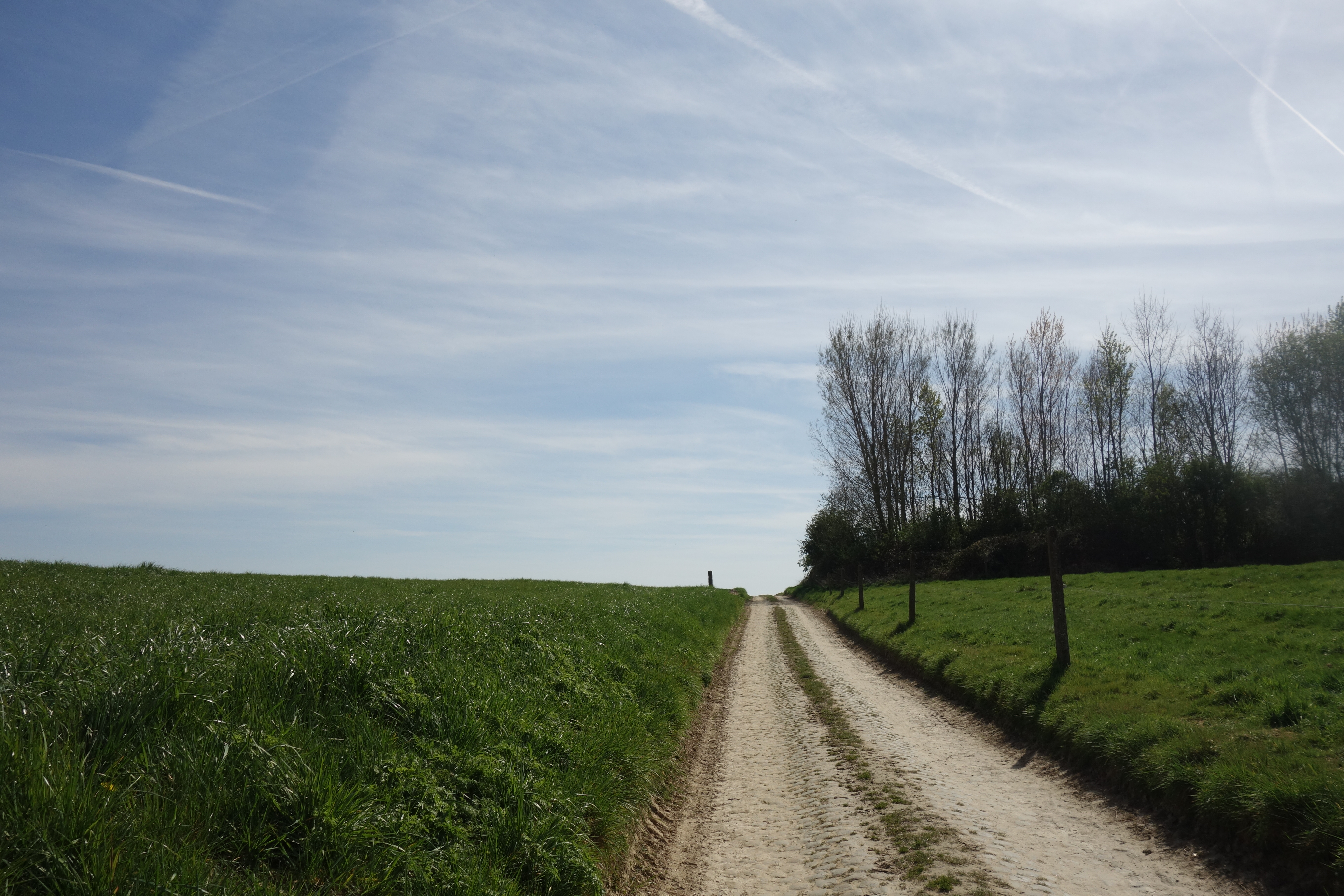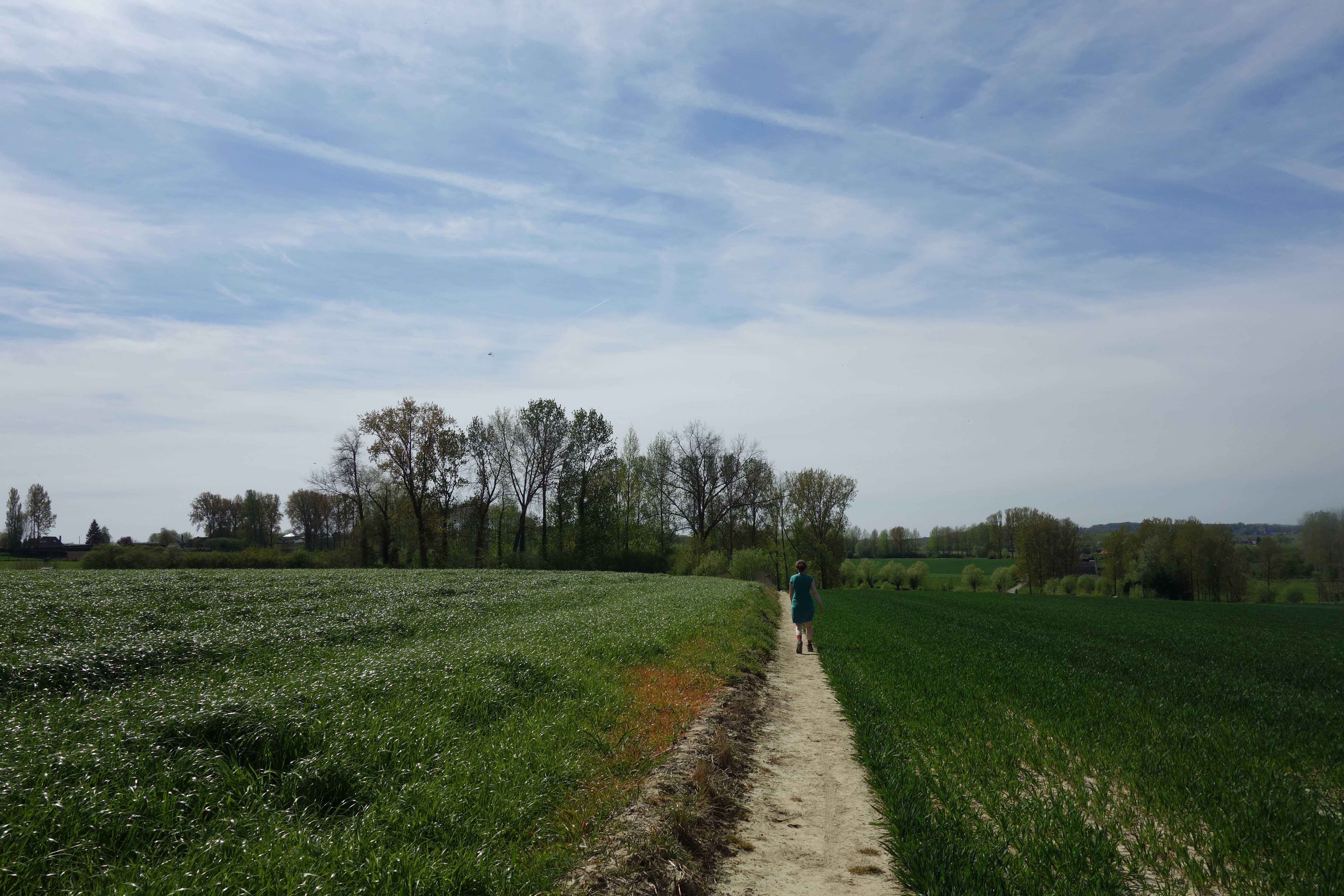 Eens terug op de juiste GR (en in de juiste richting) kwamen we aan in de Beneden-Dendervallei en meerbepaald in het Bellebroek. We hadden op een anderhalf uur toch al mooi de volle 1,6 kilometer van onze 30 voorziene kilometers gedaan. Er was dus nog best wel wat te temmen. Op deze zonnige zondagochtend waren we trouwens niet de enigen op pad. Er waren heel wat wielertoeristen en een overijverige vrouw nam mij bijna mee in haar enthousiasme. Maar ik kwam er er zonder kleerscheuren of kwetsuren van af.
