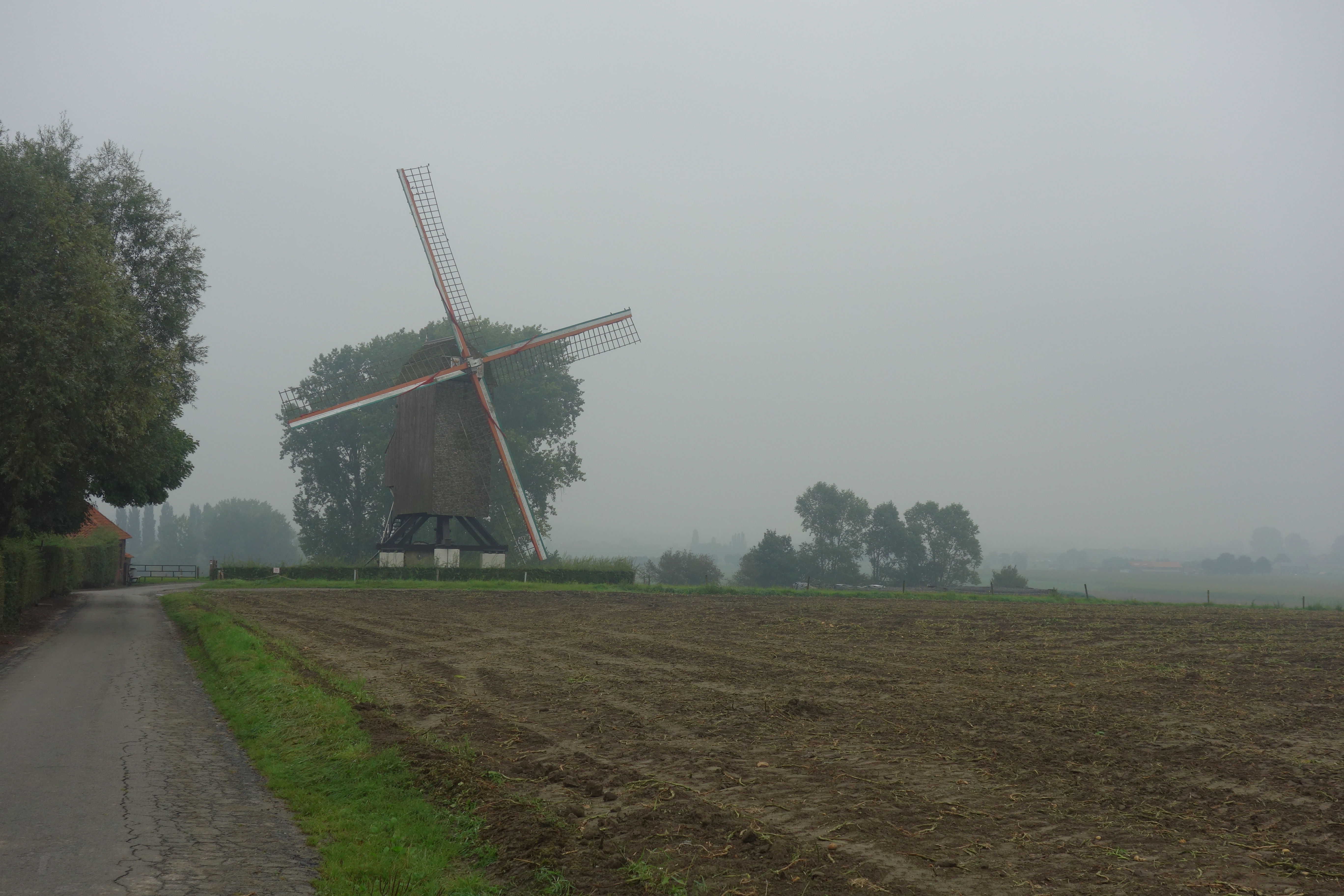 Na het bereiken van de overkant van de spoorweg begon een mistige wandeling waarbij Tielt al snel werd verlaten voor de betere lokale weg in het groen. Ons eerste hoogtepunt van de dag (en van ons GR 128-avontuur) ligt iets verder op de Poelberg. Deze Poelberg (45 meter hoog) wordt voorgesteld als een lokale Baskische mini-puist, maar de hoge stijgingspercentages lagen duidelijk aan de overkant.