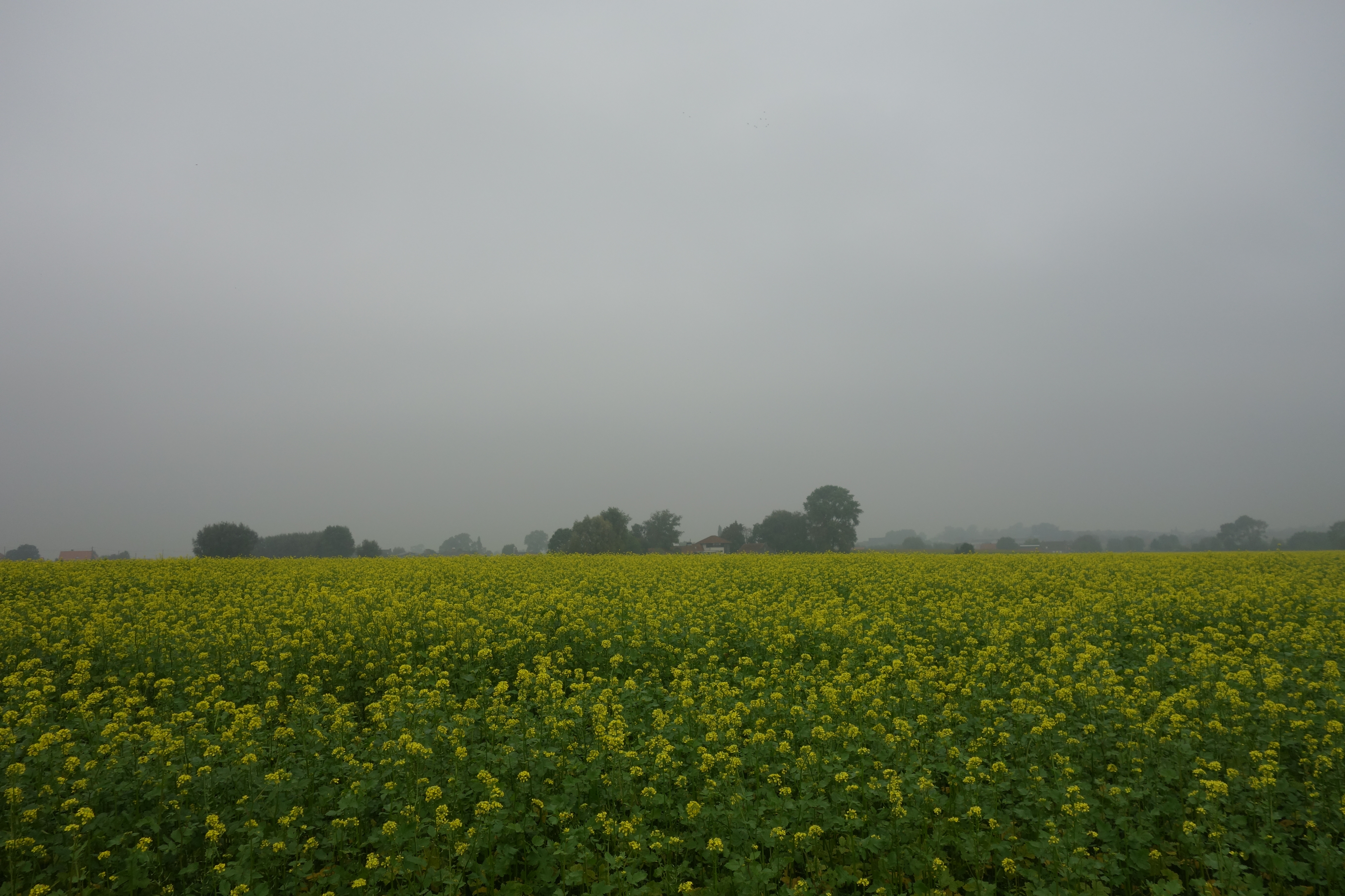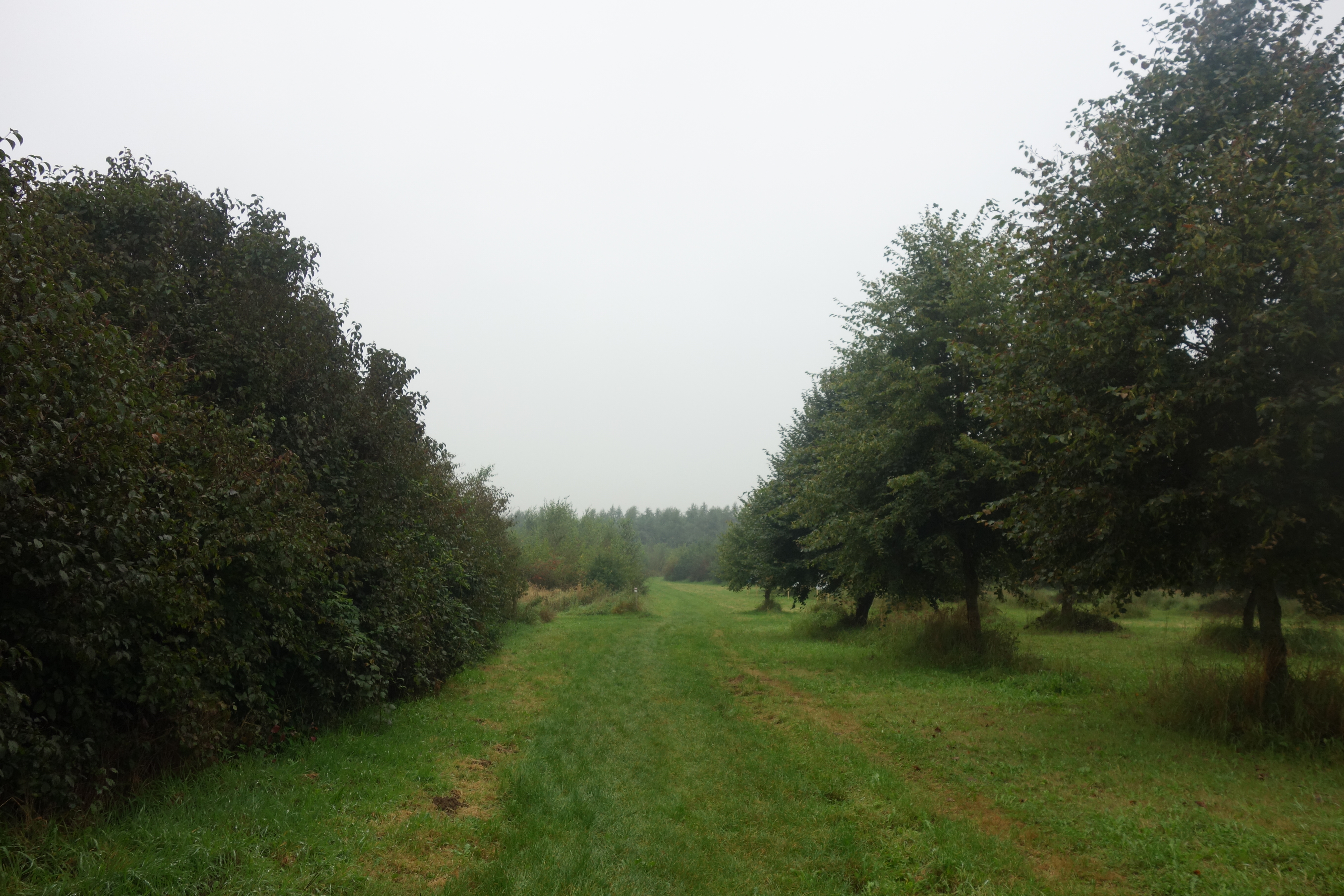Na het bos volgt de GR 128 grotendeels veldweggen, graspadjes en af en toe een asfaltbaan, richting de steenweg die onder Aarsele loopt. Over het algemeen mag je op deze etappe niet klagen over de ondergrond. Het is heel vaak onverhard, wat het malen van de kilometers aangenamer maakt. De vergezichten zijn ietsje minder dan ze konden zijn, omdat tot de middag de velden nog verhuld zijn in nevel en mist. Het geeft weliswaar ook een zekere charme aan het geheel.