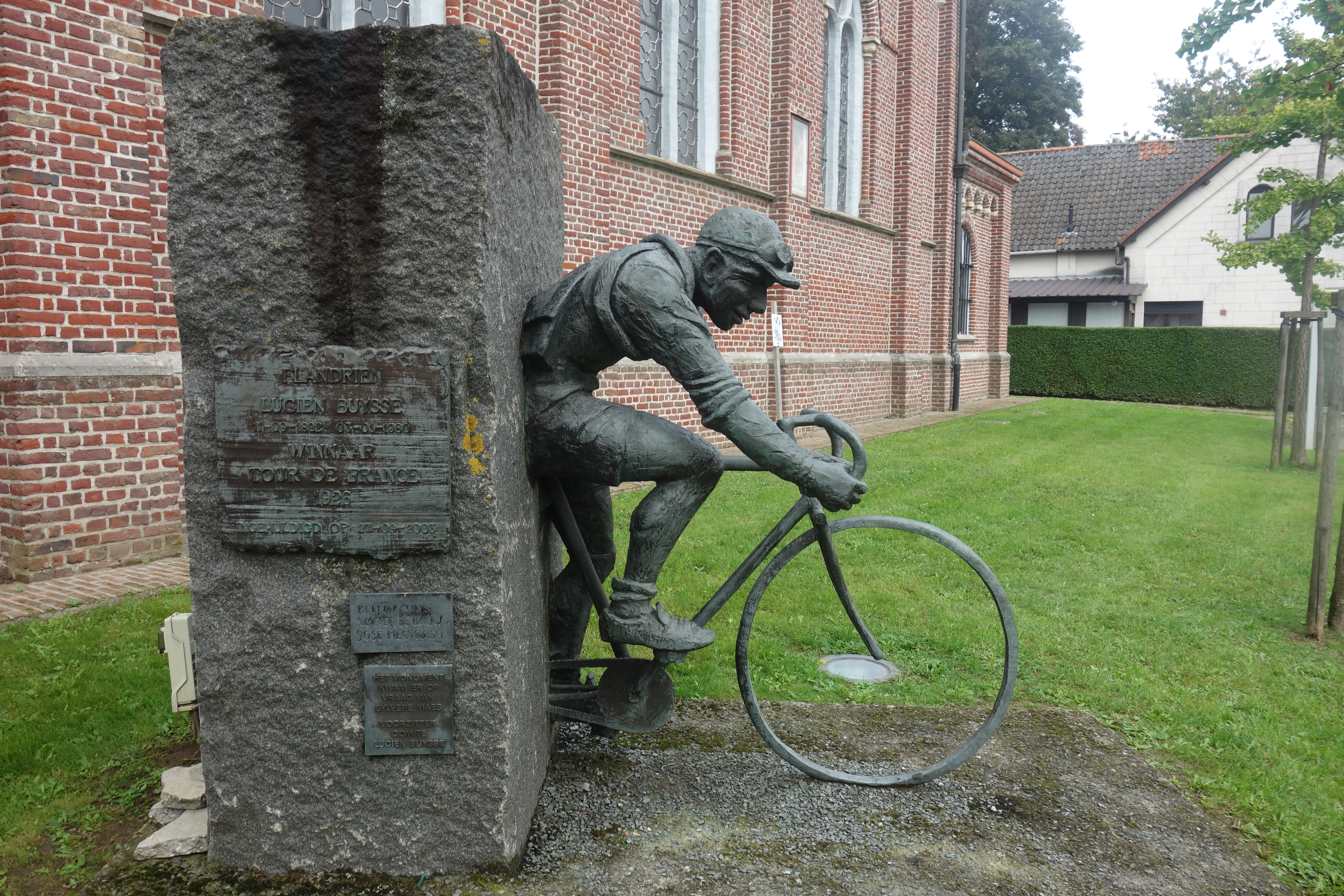 Het gaat daarna van kerk naar kerk. De eerste is een goede 3 kilometer verwijderd. De kerk van Wontergem is langs buiten niet al te speciaal, maar heeft wel nog een mooie binnenkant. Verder zijn hier ook bankjes die zich lenen tot het nuttigen van een kleine snack of je lunchpakket. We waren niet de enige met die idee, getuige de enthousiaste groep van 10 vrouwen die deelnamen aan een wandeling van de Wandelclub De Natuurvrienden Deinze. Aan deze kerk is er ook een standbeeld voor de wielrenner Lucien Buysse, die 5 etappes won in de Ronde van Frankrijk en eindoverwinnaar was in 1926.