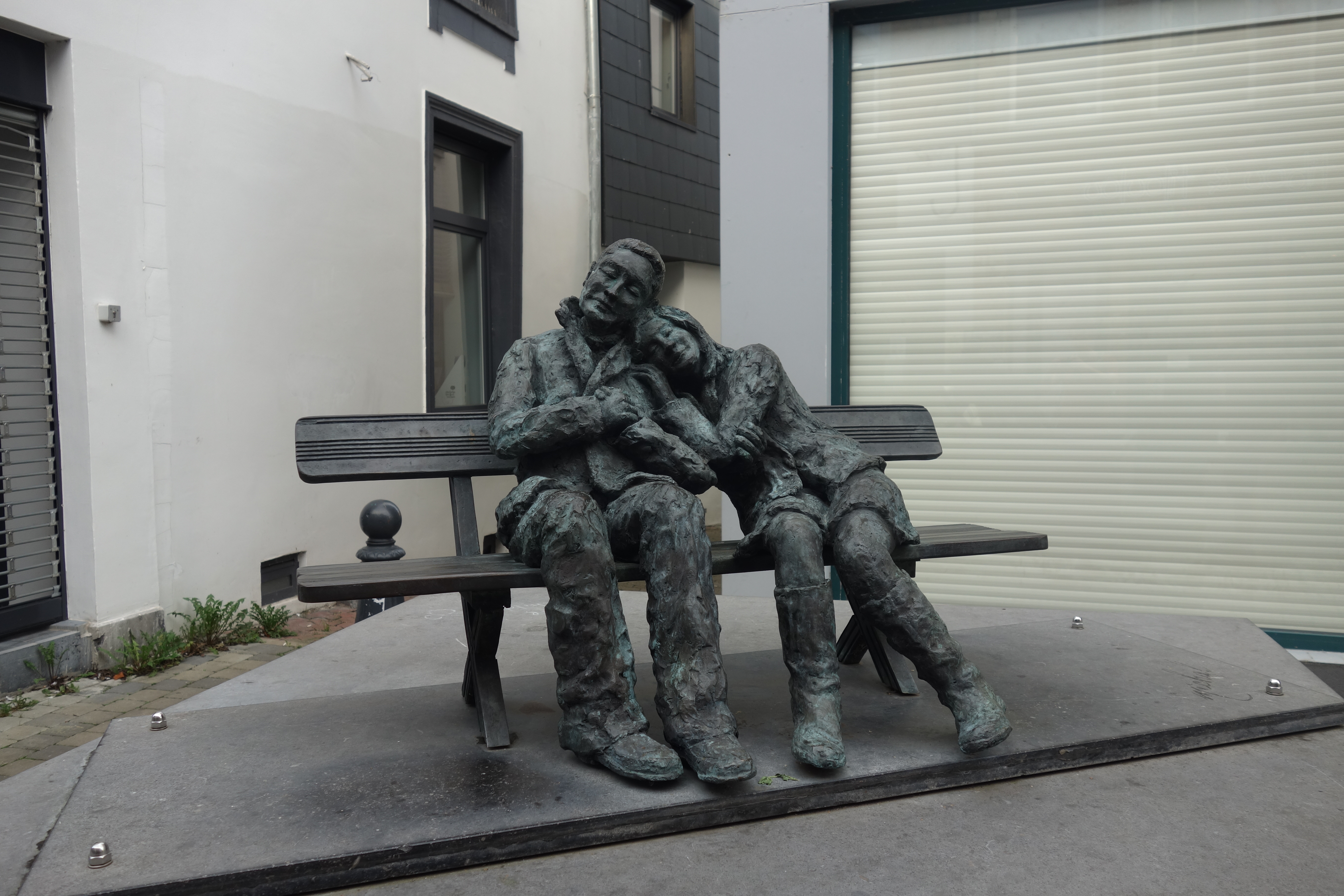 Meteen hierna ging het kort maar stevig omhoog naar het Sint-Alenapark, eerder een volwaardig bos dan een verzameling gras met her en der een boom. Het werd duidelijk dat ondanks het mindere weer heel wat gezinnen van beide groene plekken genoten. De natuurpracht werd even onderbroken door een ander architecturaal bekend stuk Dilbeek: CC De Westrand. Dit cultuurcentrum heeft niet alleen een goede regionale reputatie, het is ook de plek waar de befaamde slogan “Dilbeek, waar Vlamingen thuis zijn” te vinden is.