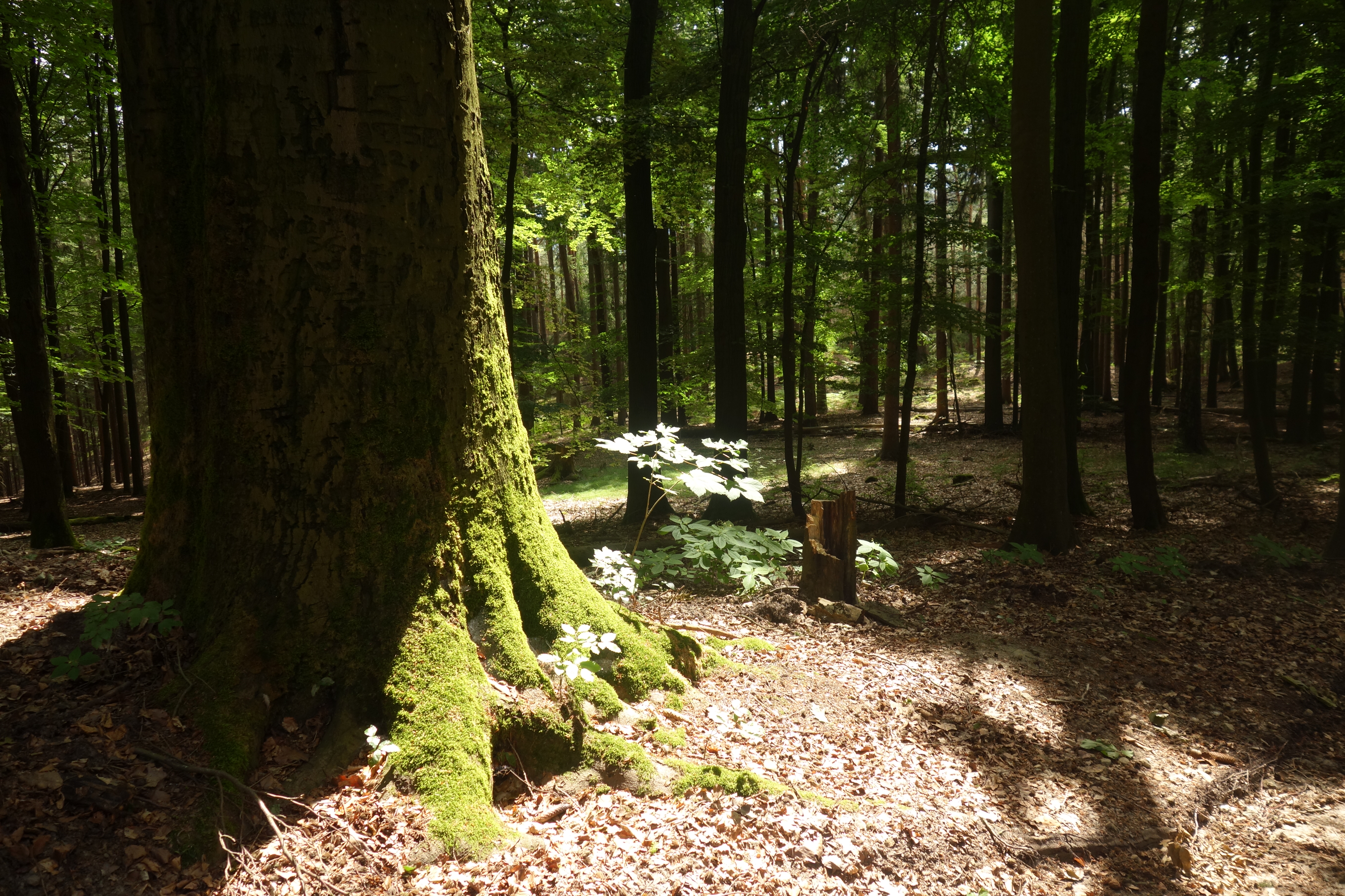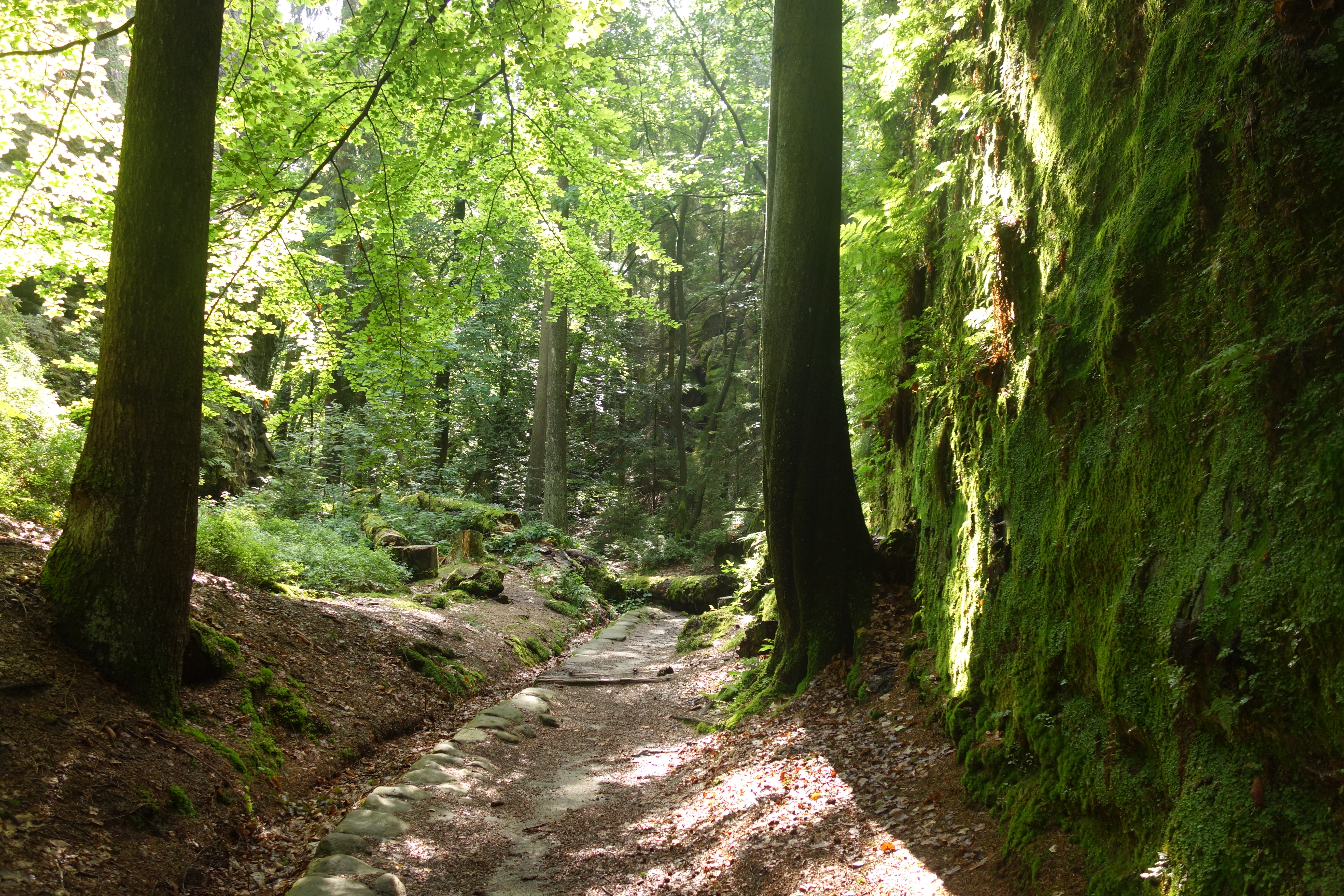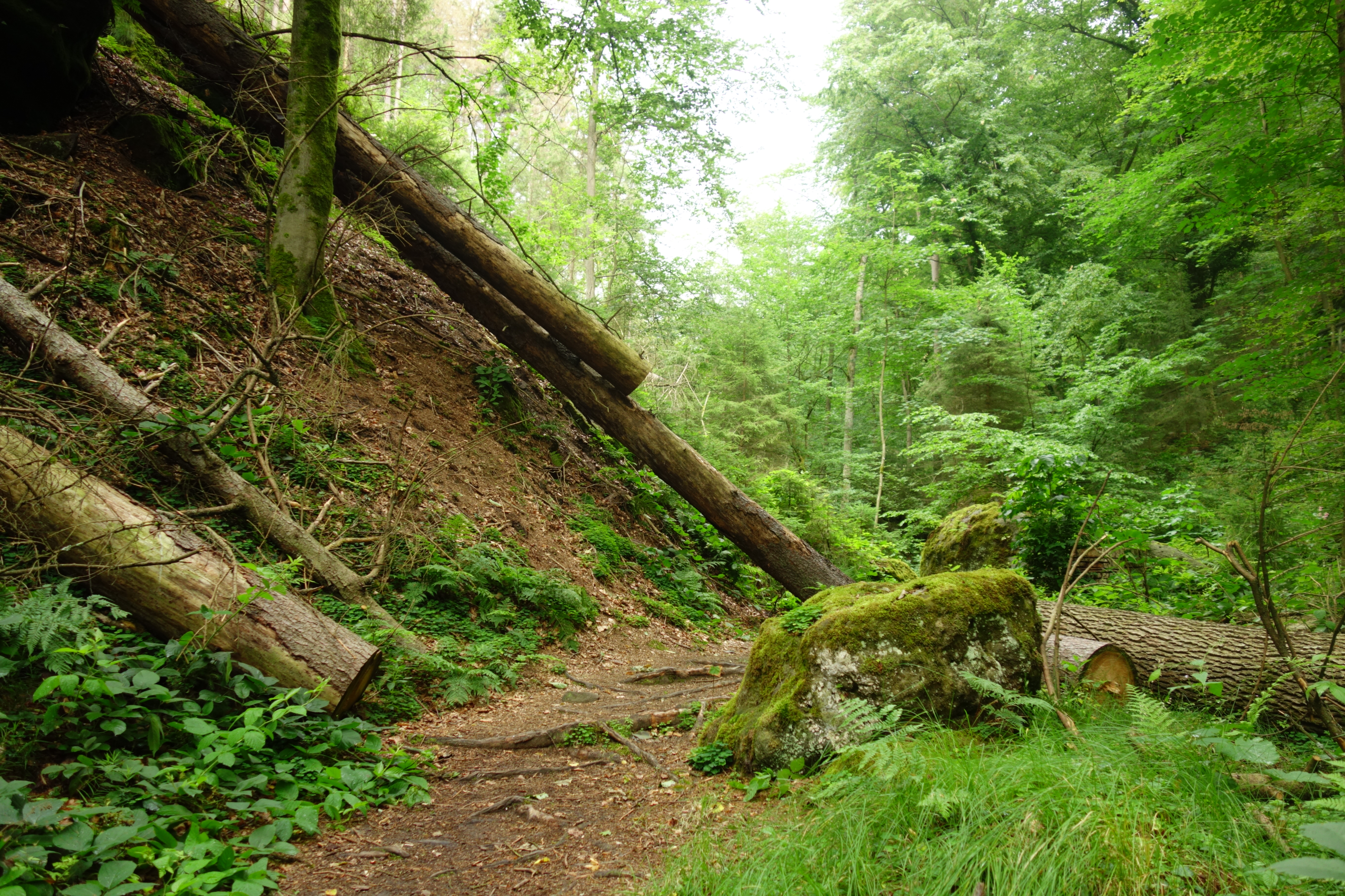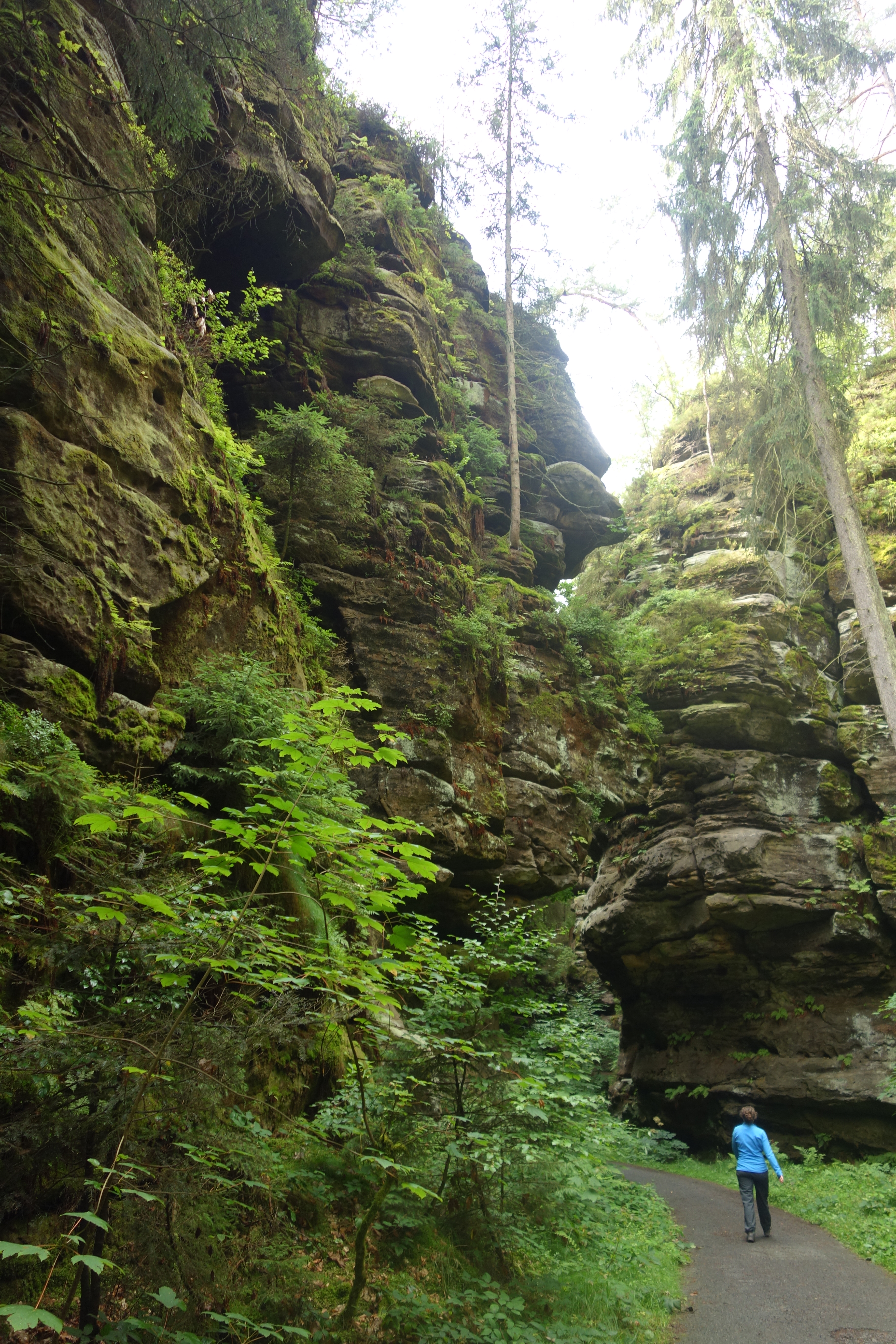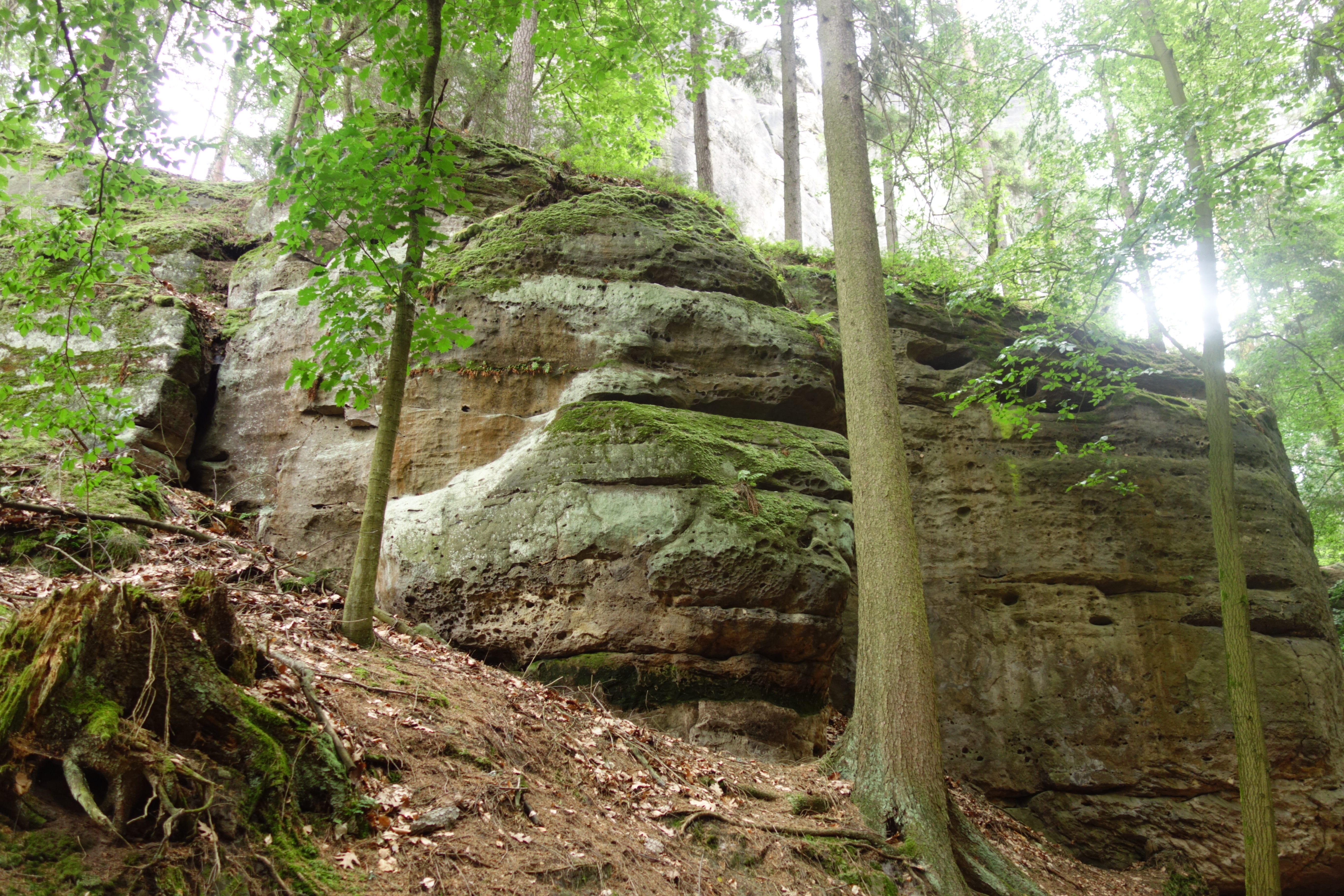 Daarna volgde een passage die deed denken aan het stukje na Hohnstein, alleen was het allemaal nog grootser, schoner en majestueuzer. De rotsen torenden boven ons uit, vaak mossig. Indrukwekkende boomstammen lagen geknakt op de heuvelrug. Bijna elke rots was fotogeniek. Het was een hele (natuur)ervaring om hier te wandelen.