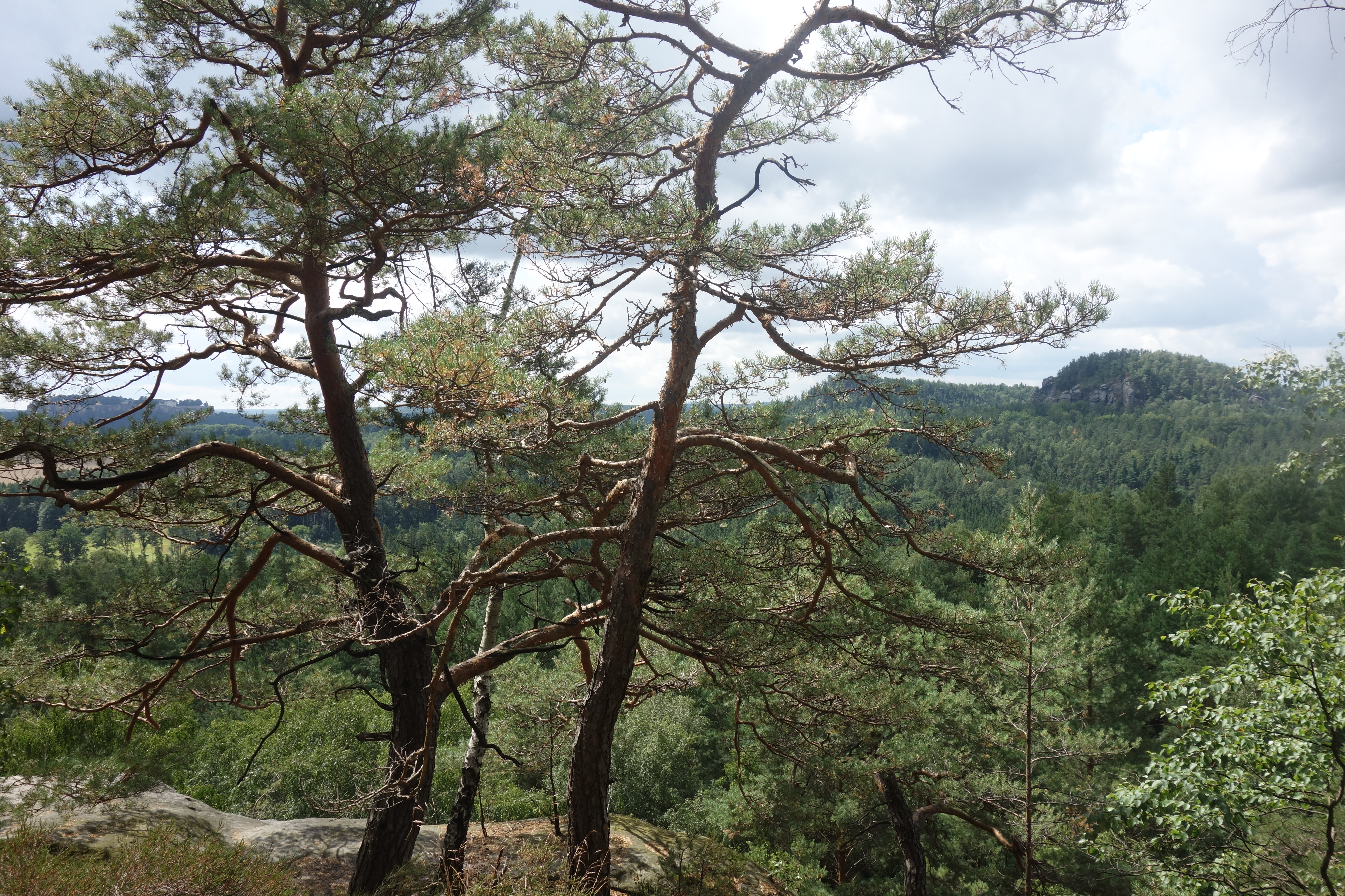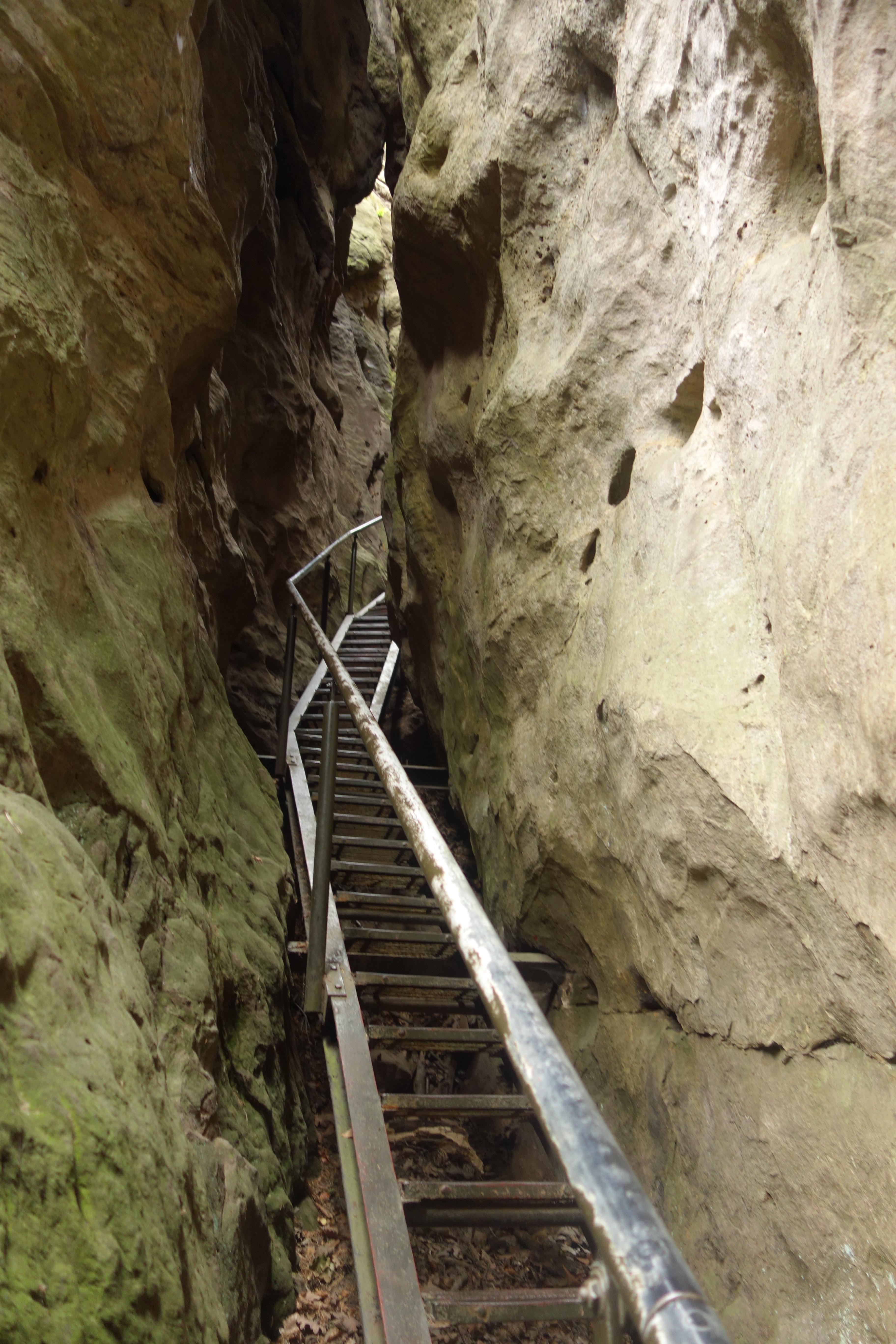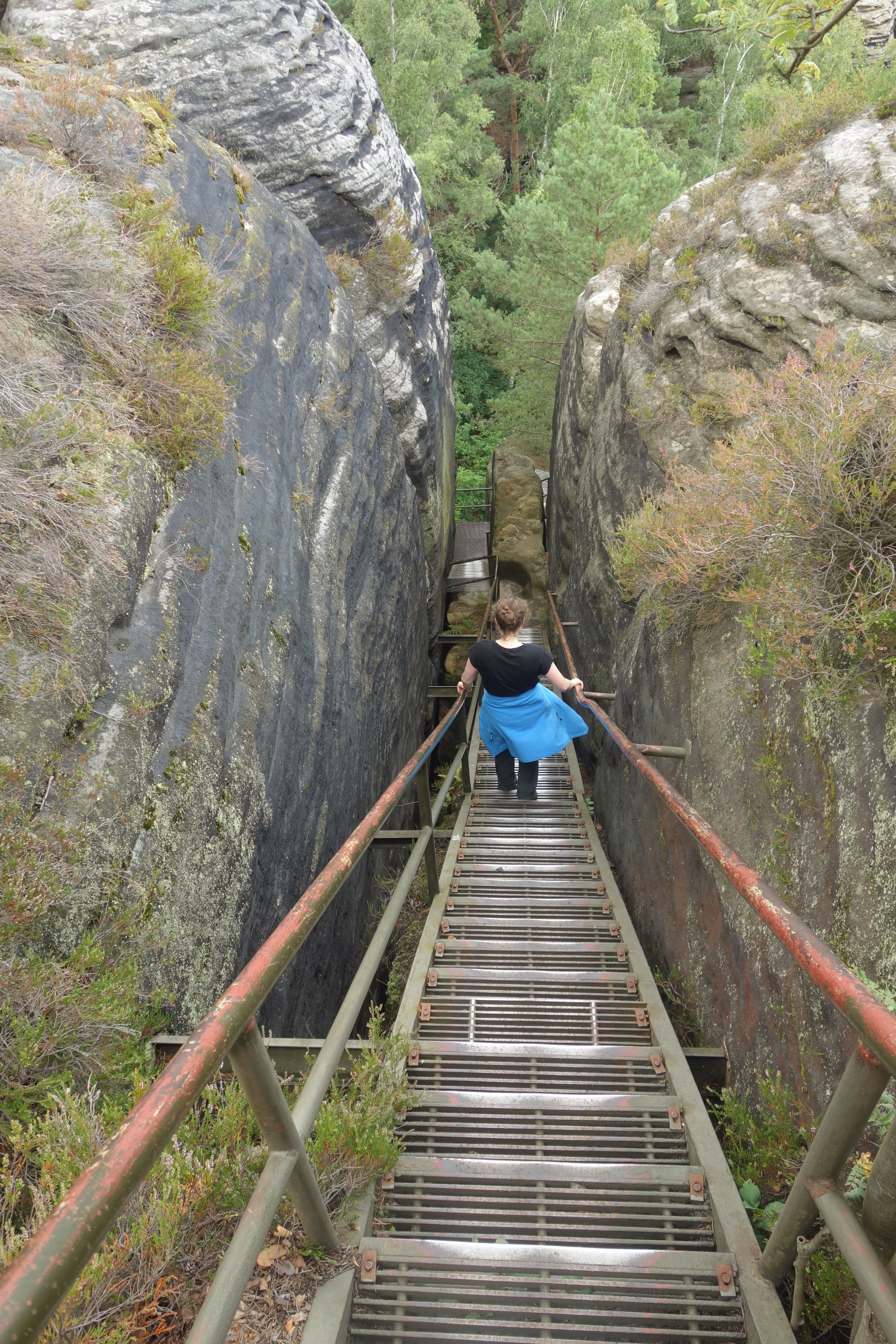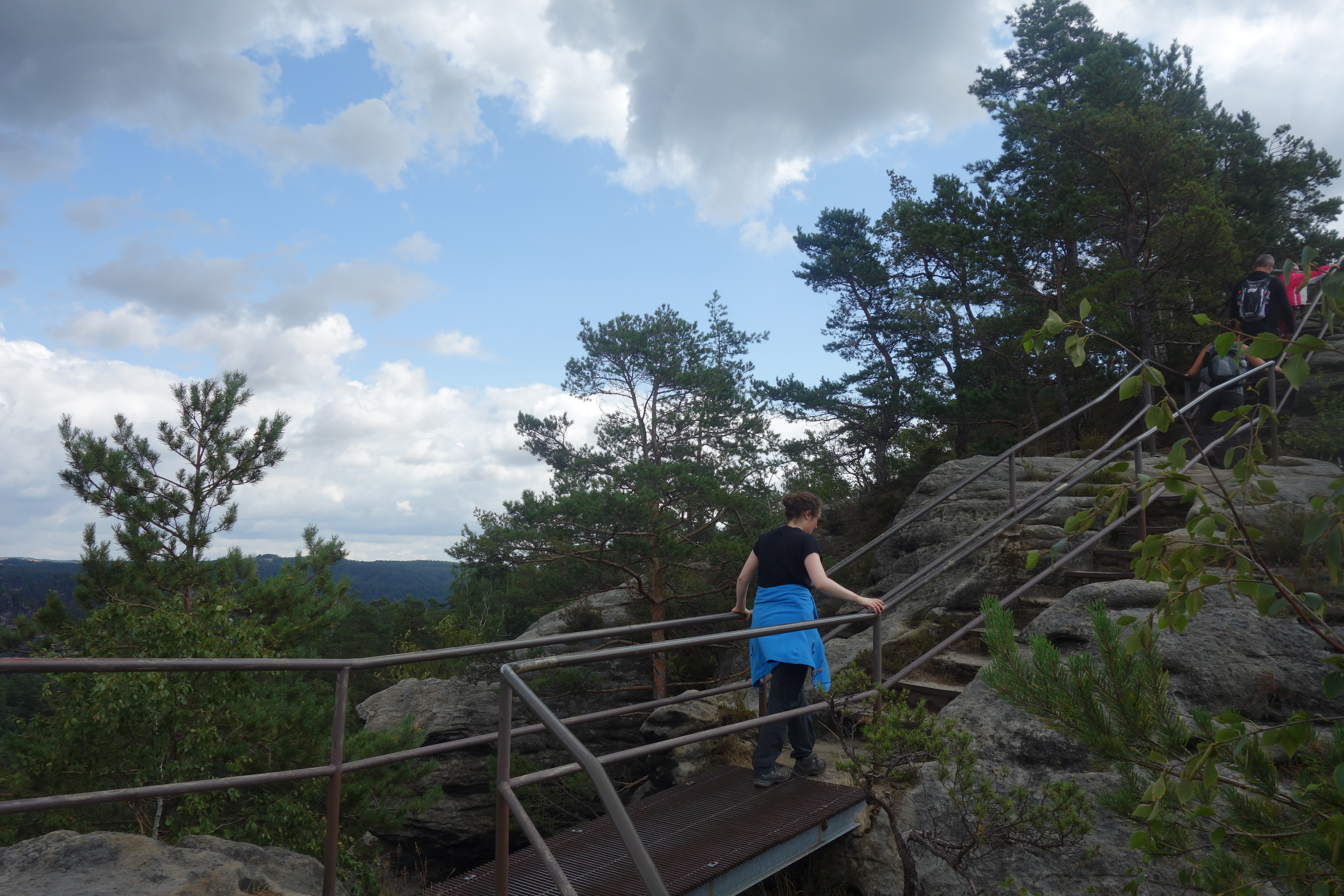 Na de Elbe even te volgen aan de overkant was het opnieuw klimmen geblazen. In eerste instantie leek het een naar lokale wandelnormen bescheiden vervolg te worden op een aangenaam bospad. Maar dat was zonder de passage over de tafelberg Rauenstein gerekend. De wandeling voerde ons over en tussen de rotsen met stenen en ijzeren trappen en rotsige passages, af en toe met hulp van een railing.