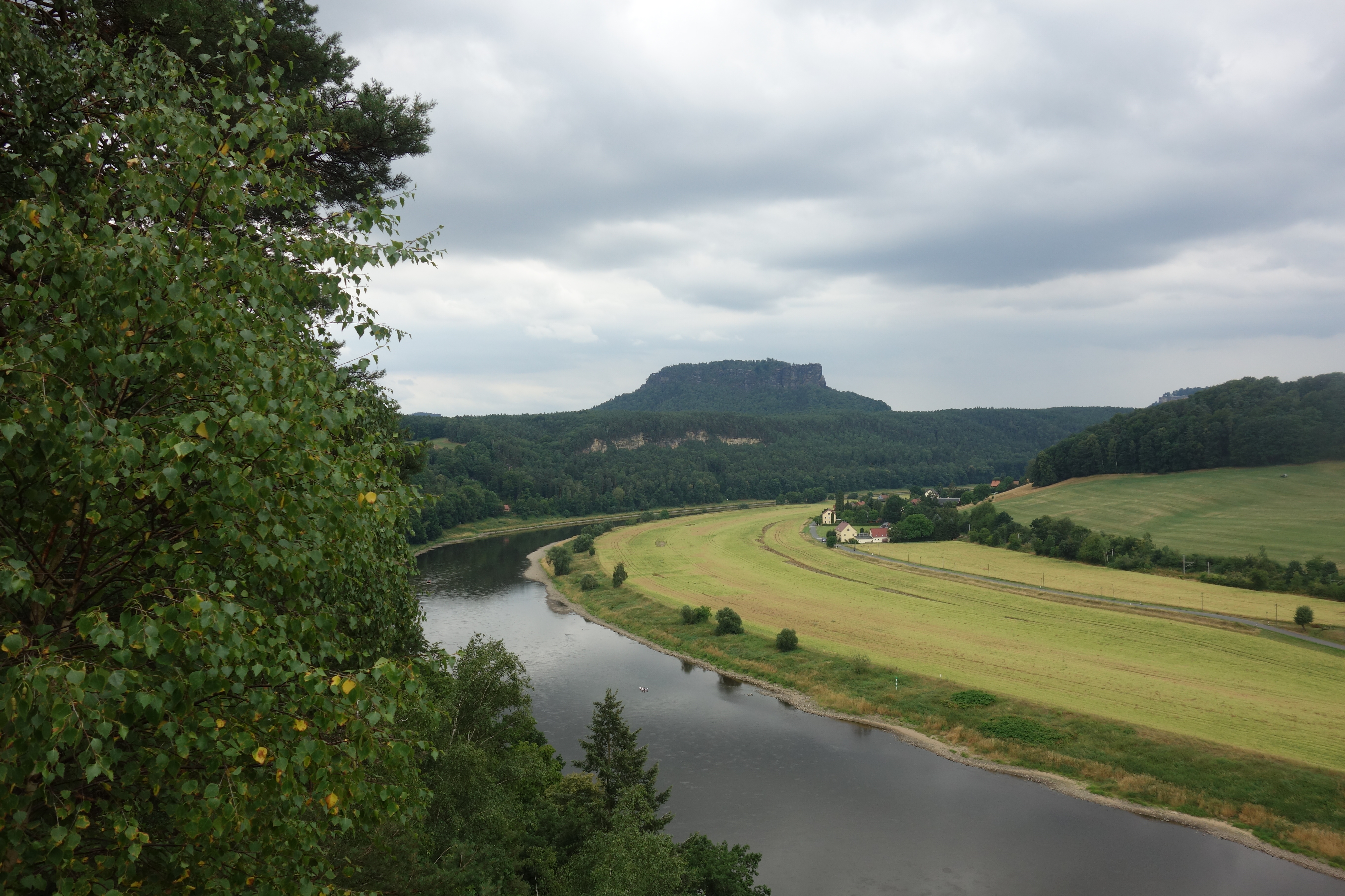 Het aantal dagtoeristen maakte duidelijk dat dit zeer populair was, maar de uitzichten waren dan ook opnieuw fenomenaal. Na een langere stukje ijzeren trap naar beneden ging het via een breed pad tussen de weiden naar het kleine dorpje, Weißig, dat vandaag dienst deed als lunchplek van de dag.