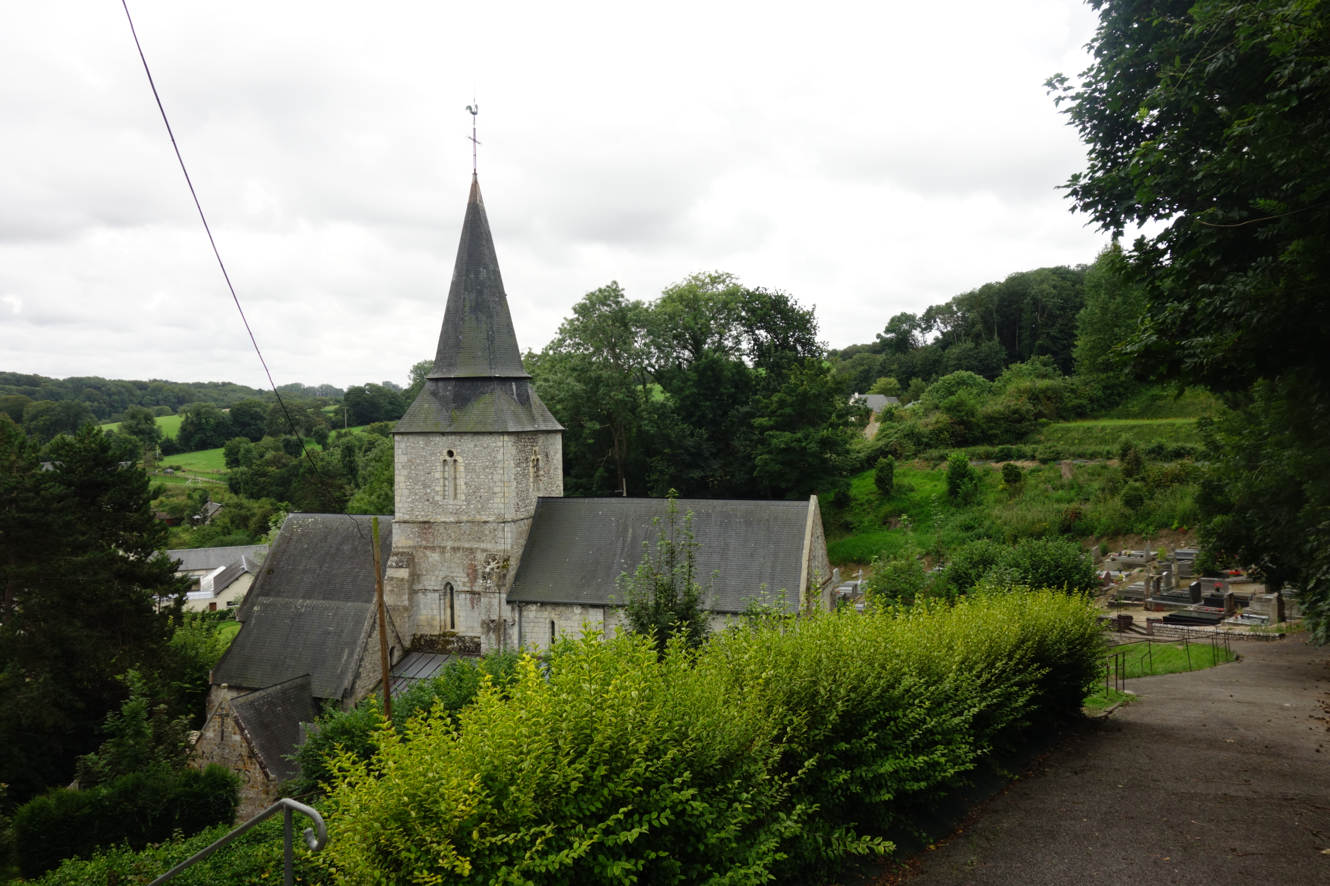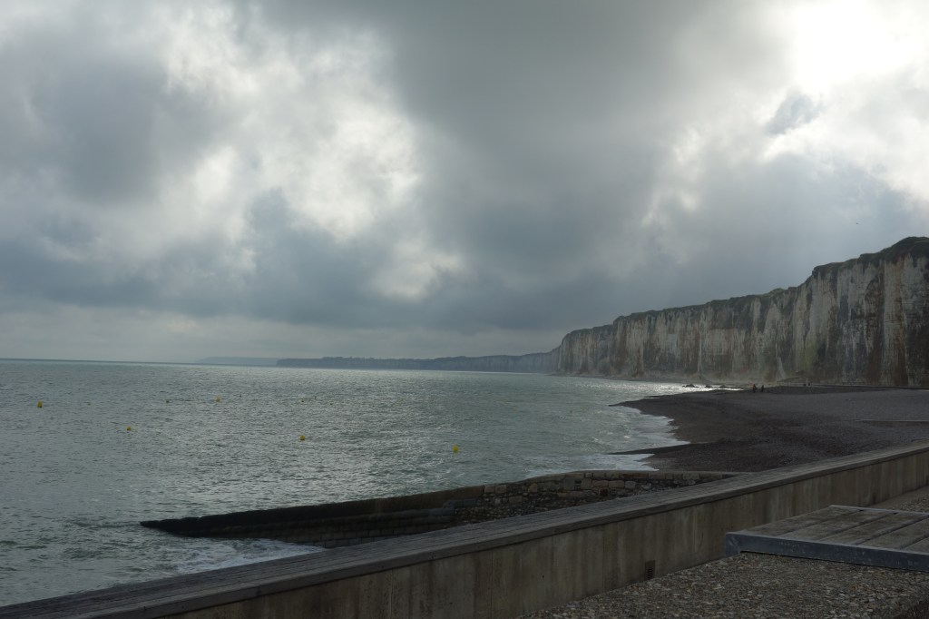 Ons eerste echte ijkpunt was Veulettes-sur-Mer, wat we bereikten via het gehucht Le Mensil en het betere daalwerk, langsheen de kerk, waar ook enkele Commonwealth-graven te vinden waren, allen voor de “ongekende soldaat”. Veulettes zelf had een groot strand met amper volk, deels door het feit dat het een werkdag was, deels door het weer, dat toch wat donkerder was dan de vorige dagen. De blauwe hemel die gisteren al wat weg was, was nu helemaal vervangen door onheilspellend grijs.