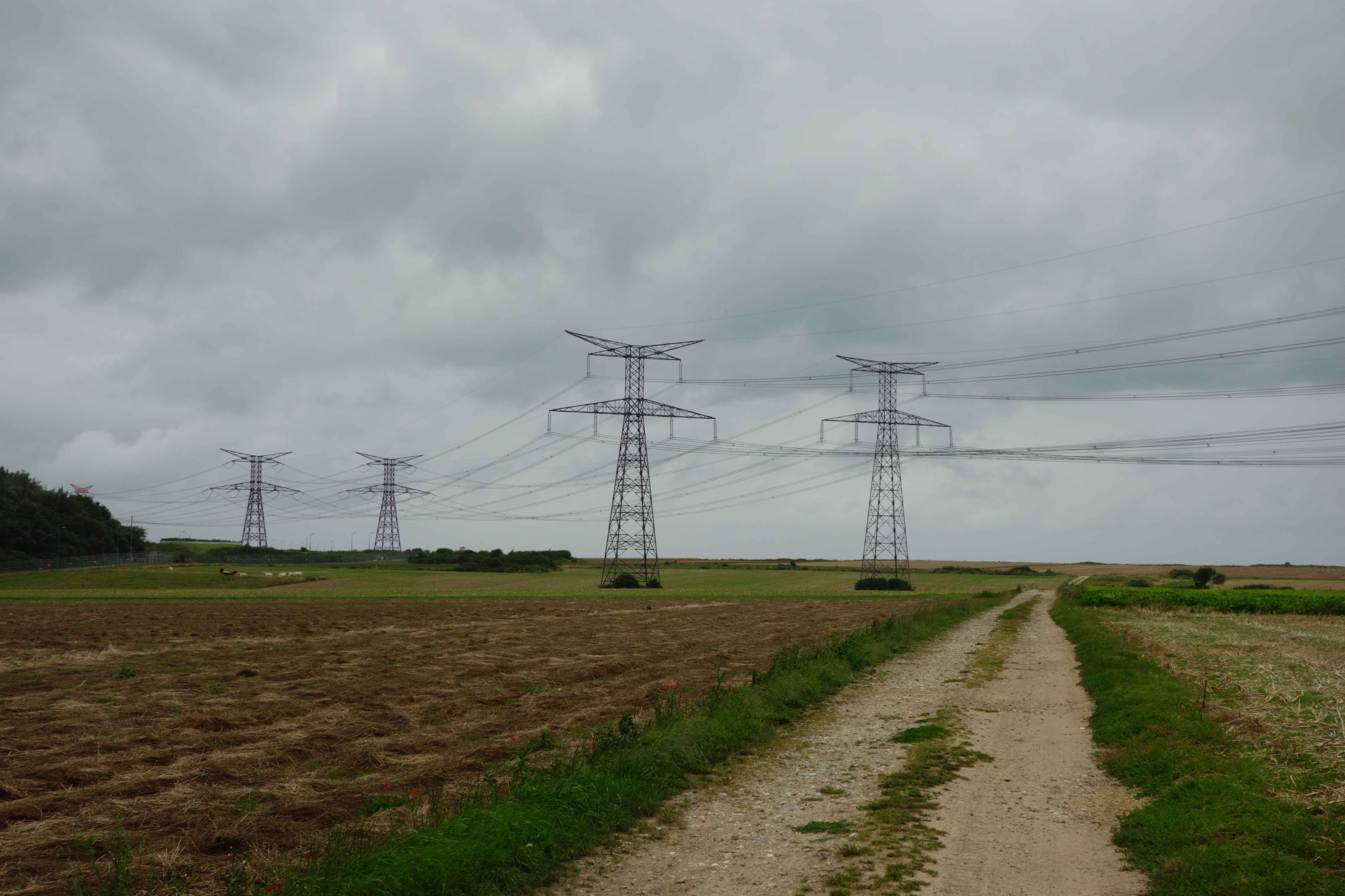 Onze middagpauze hadden we voorzien in Janville. Eerst moeten we nog voorbij een kerncentrale (in de verte), een weinig zeggend gehuchtje en verlieten we de GR voor de gpx-track, vermoedelijk door een recente trajectwijziging. Helaas was Janville, deelgemeente van Paluel, ook maar een scheet in een fles. Na een pijnlijk stukje op een astfalbaan vonden we geen bankje, ook niet aan het plaatselijke kerkje, en dus was het old skool eten in de graskant. Het smalste stokbrood ooit bleek ook niet zo voedzaam.